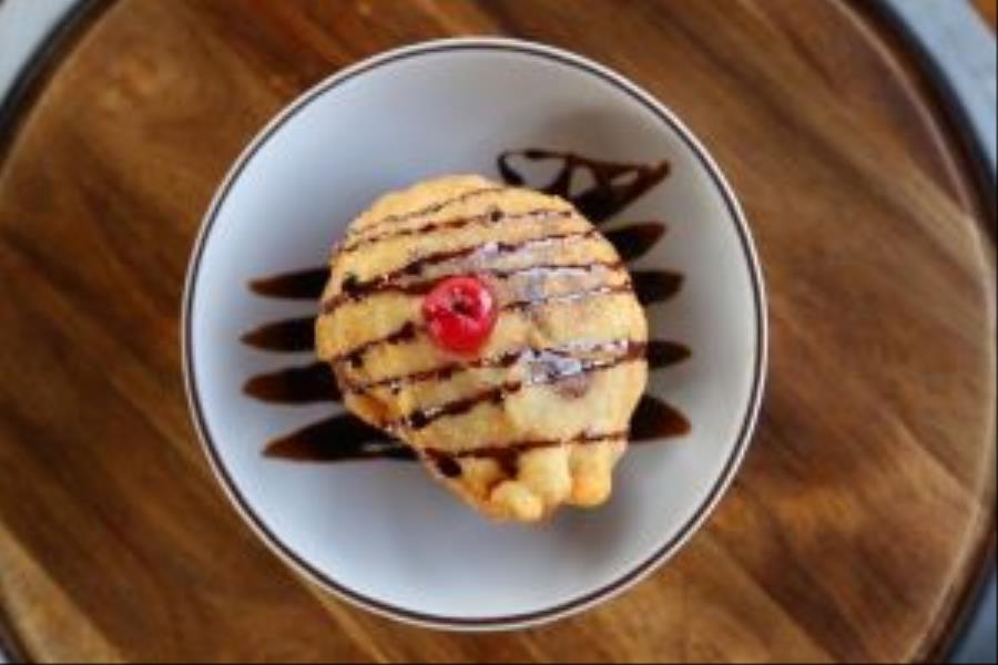 HELADO NAPOLITANO CUERTO DE PANQUE Y CAPEDO CON TEMPURA FRITO Y CORANADO CON UNA CEREZA Y JARABE DE CHOCOLATE