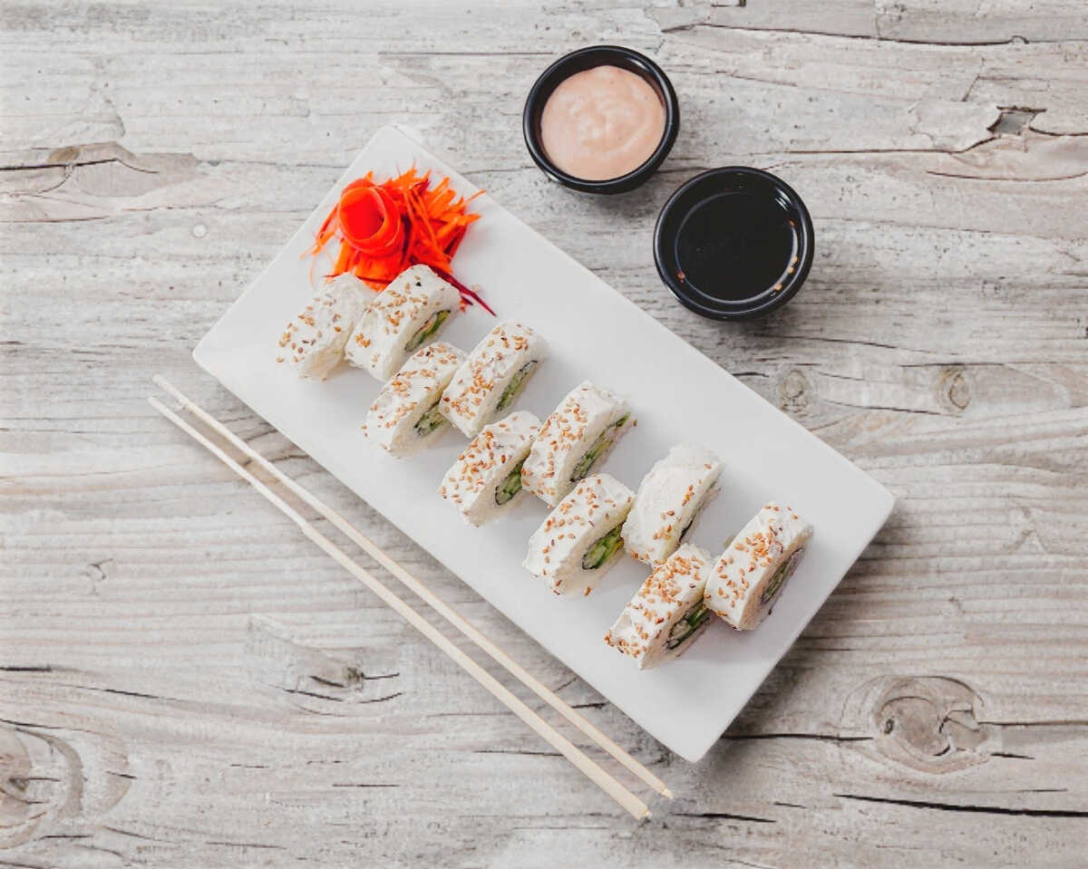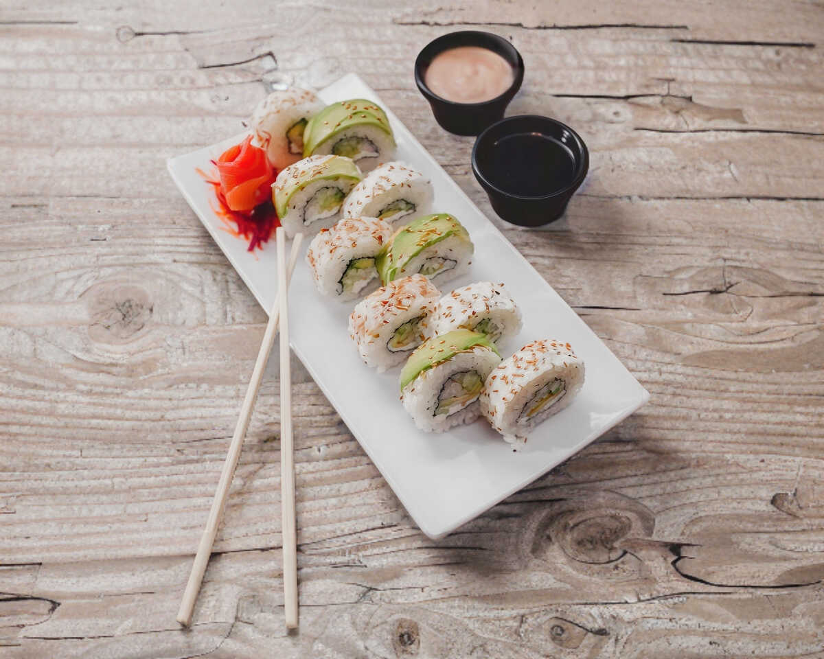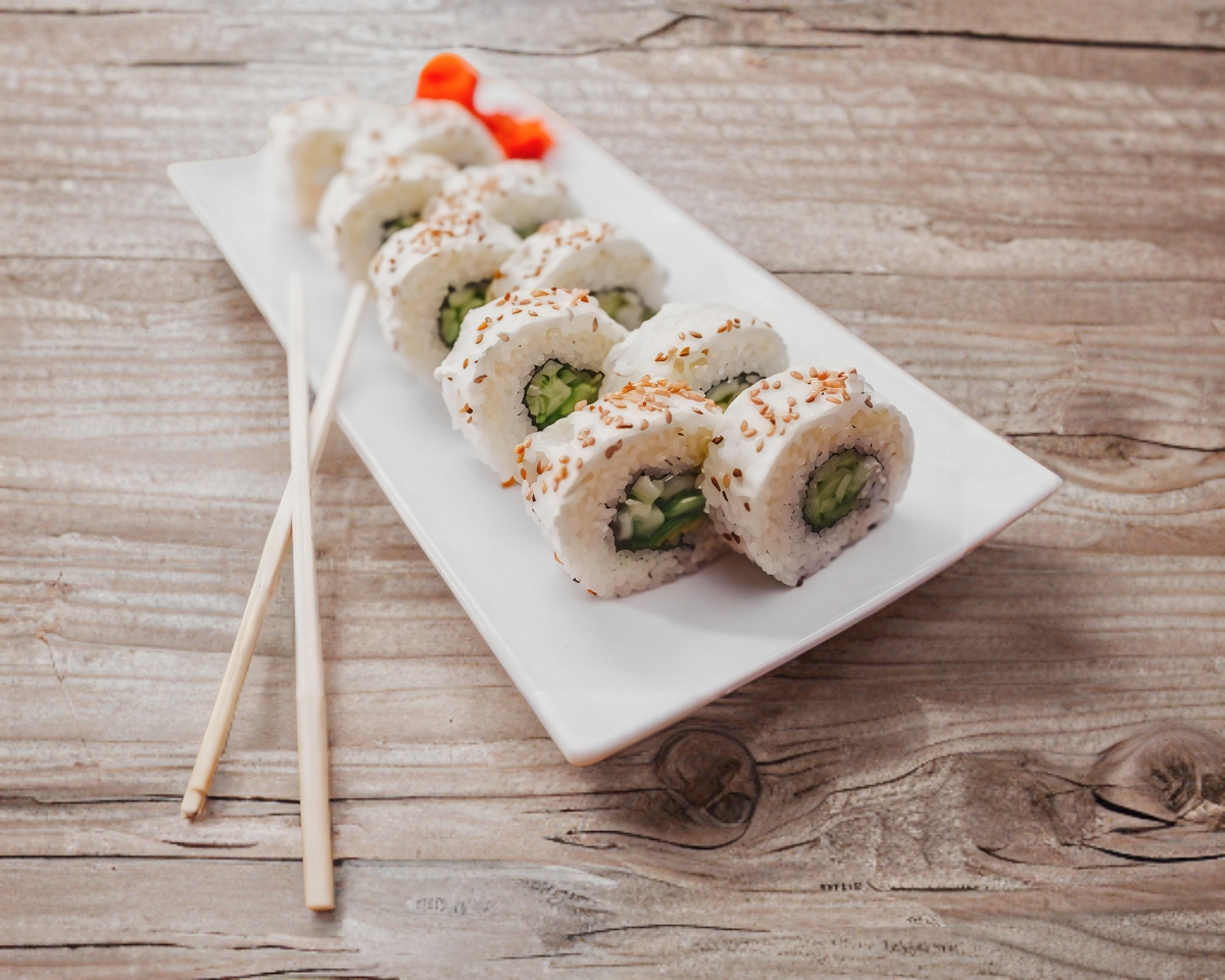 Pepino, philadelphia, aguacate y camarón por fuera ajonjolí.
