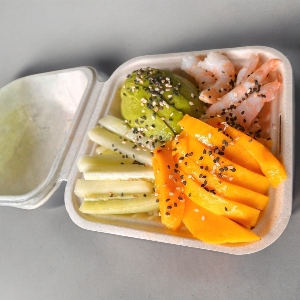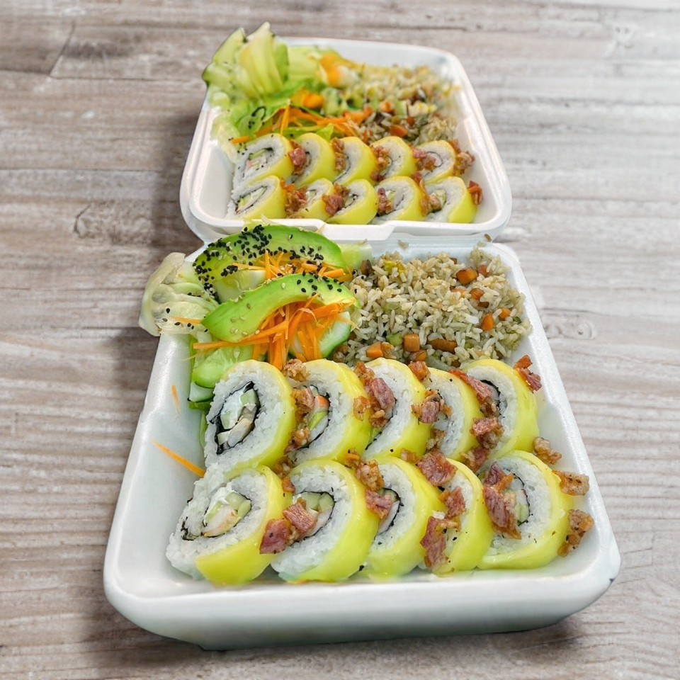 arroz blanco pepino camaron aguacate mango acompañado de salsa de soya con chile y aderezo