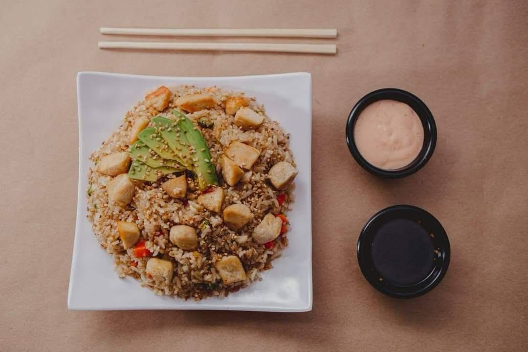 Arroz frito con vegetales, zanahoria, calabaza italiana, cebolla.