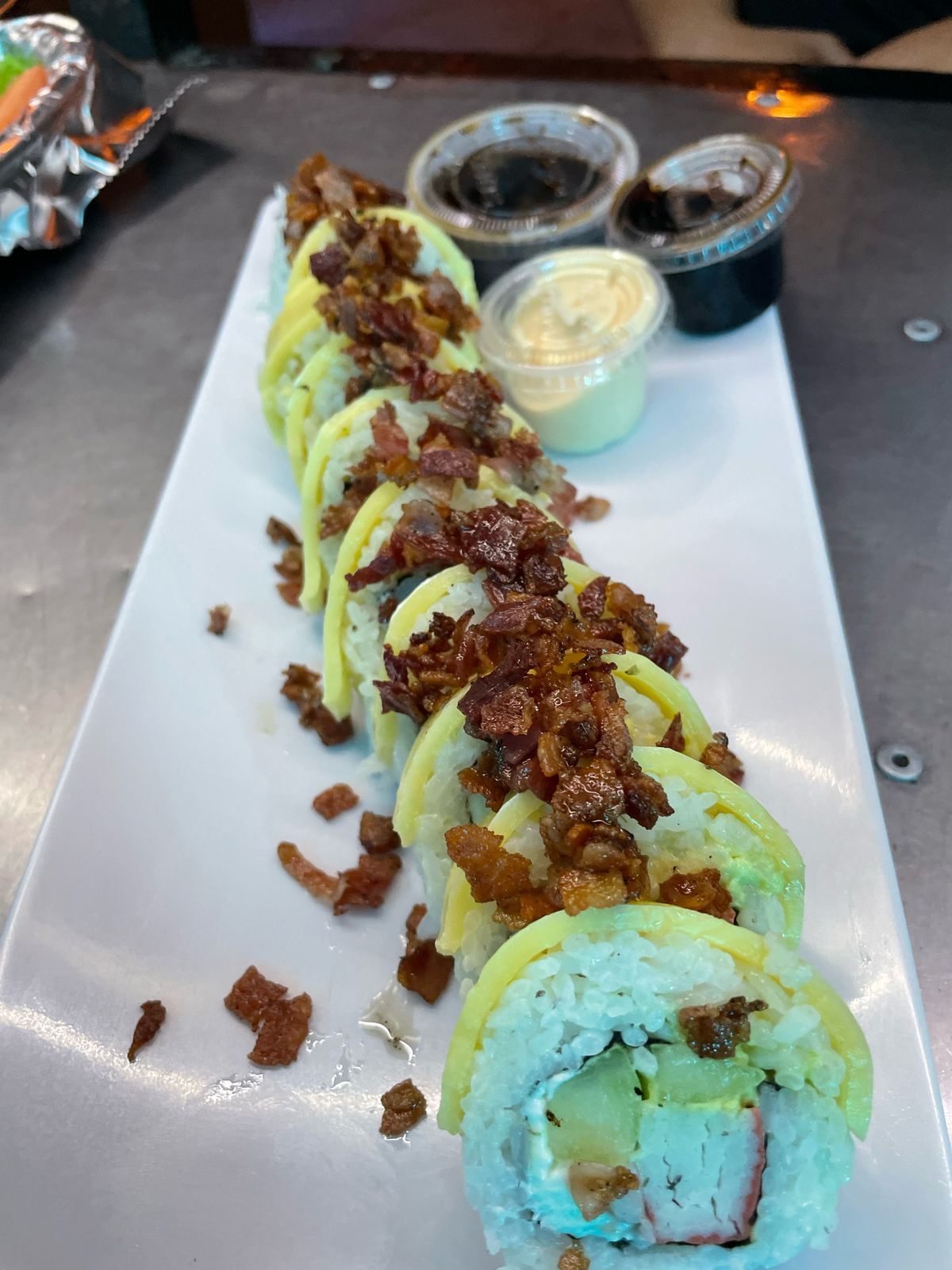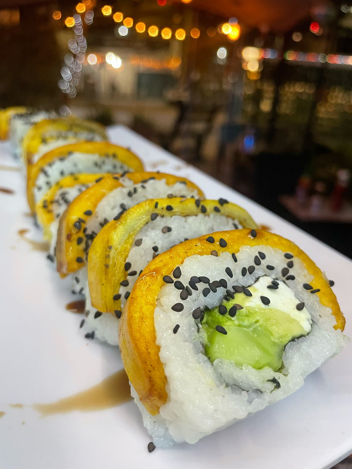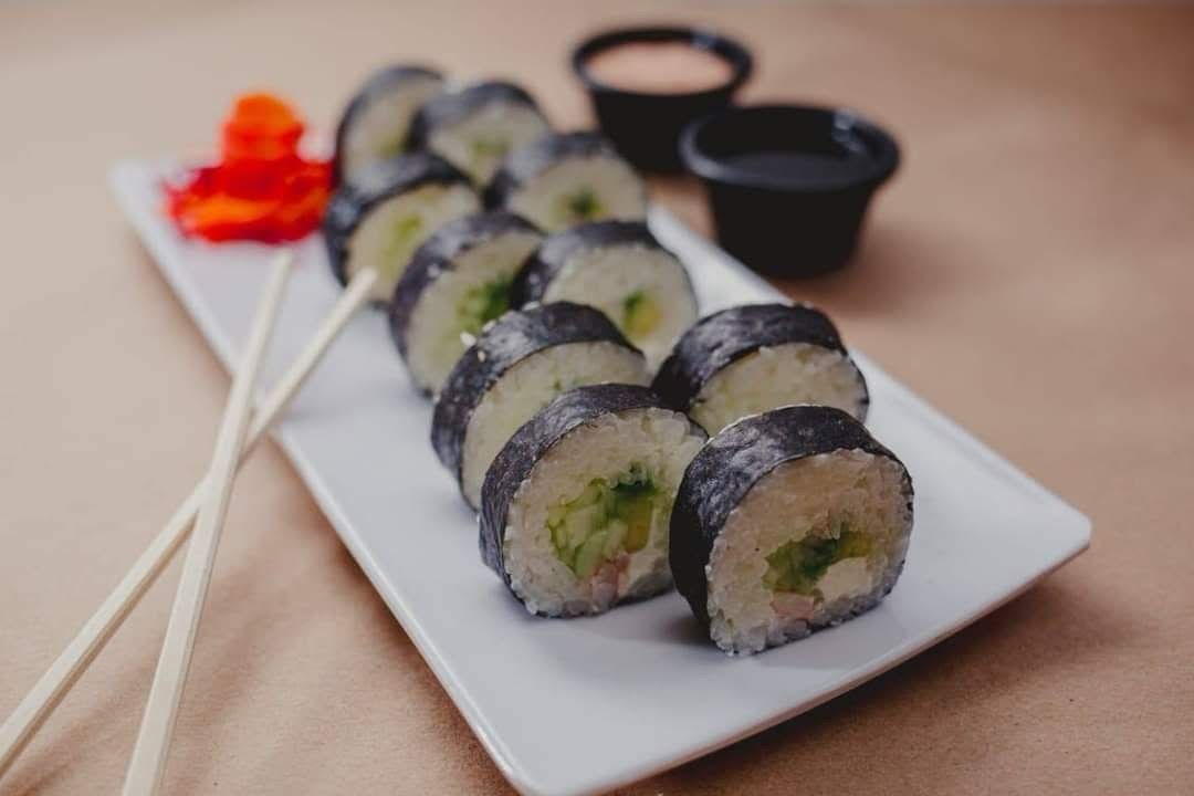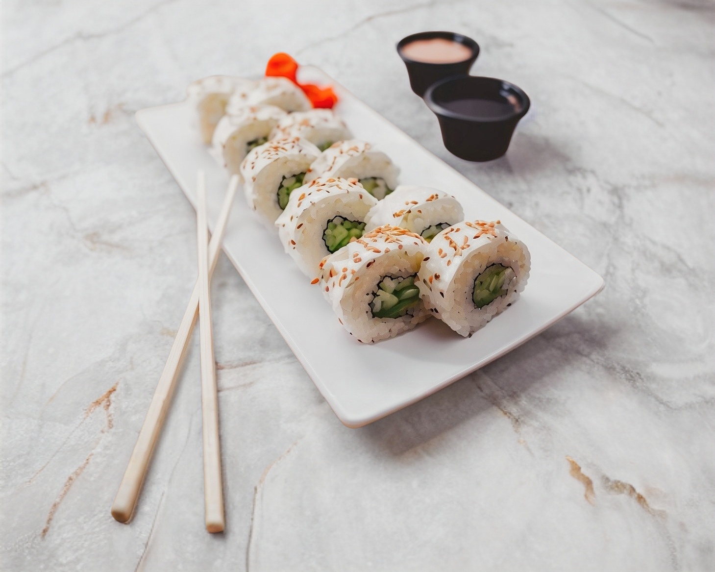 Surimi, aguacate, pepino, philadelphia, con cobertura de queso manchego con tocino.