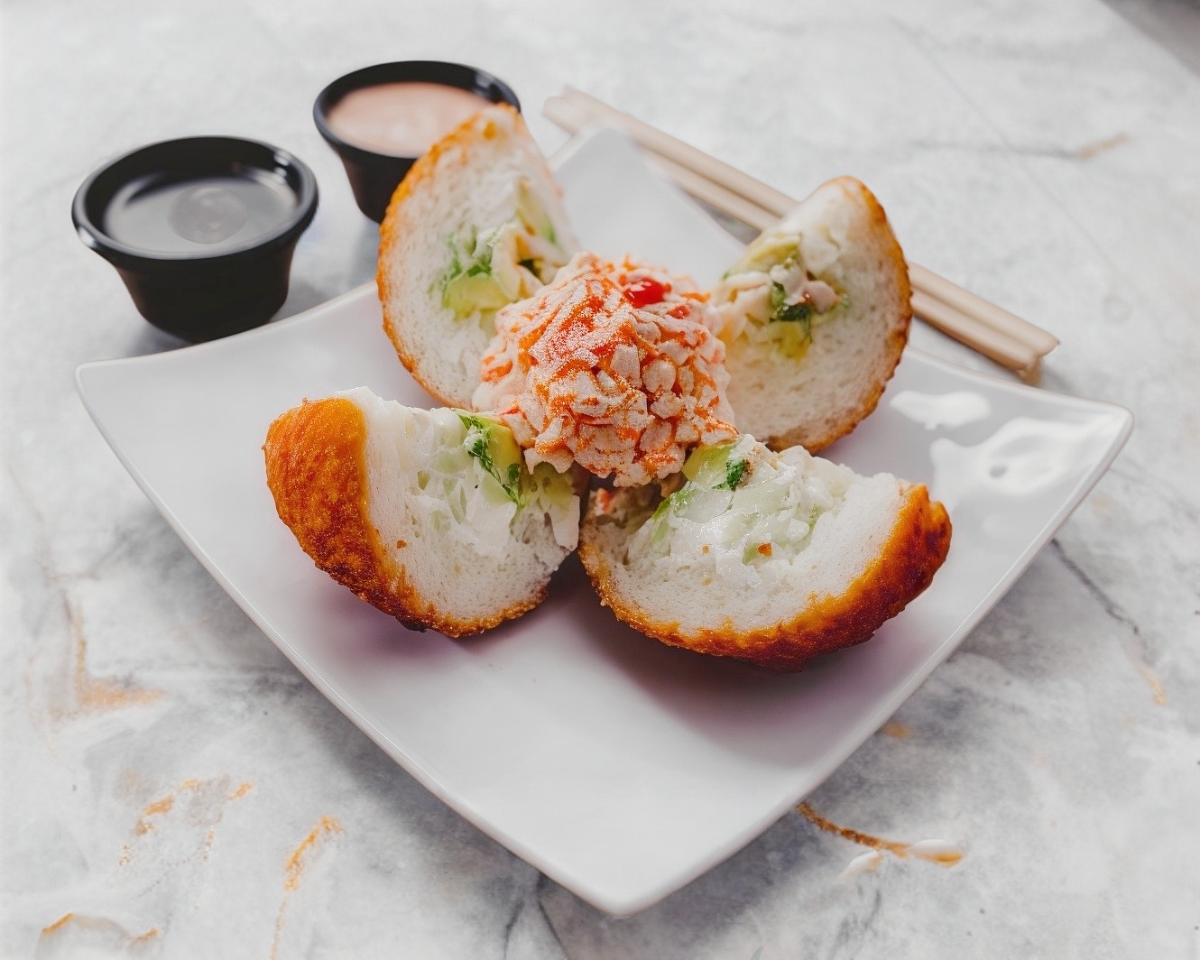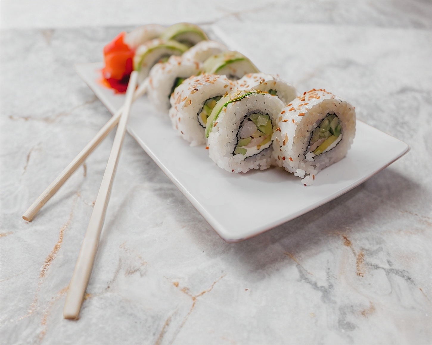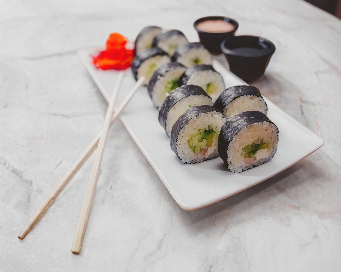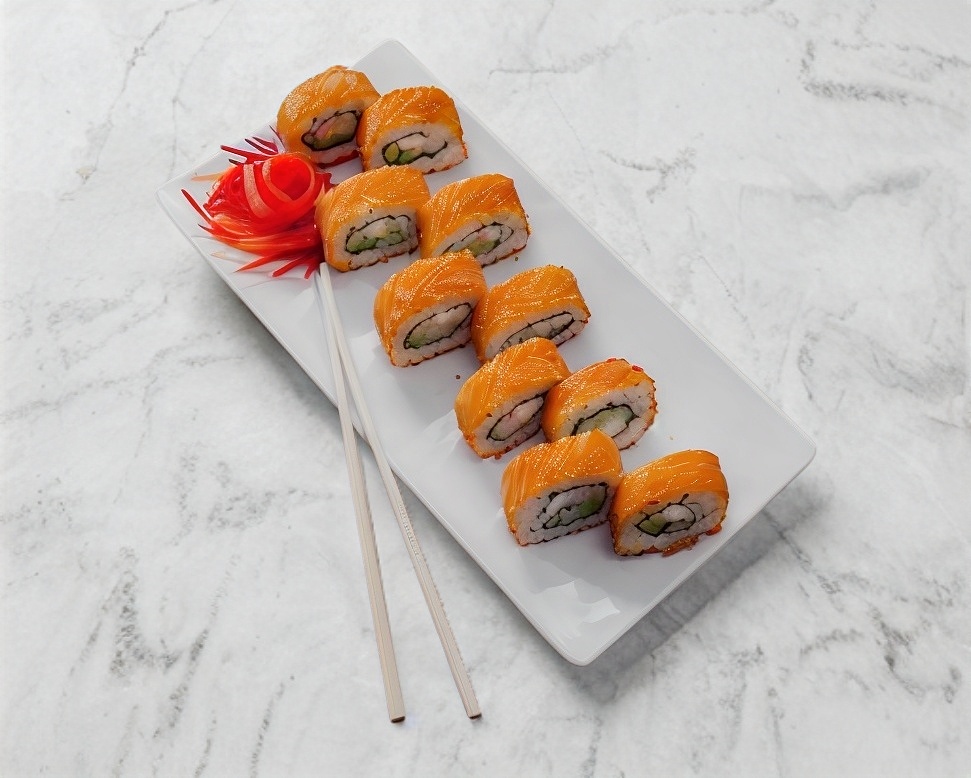 Surimi, aguacate, pepino, philadelphia, con cobertura de queso manchego con tocino.