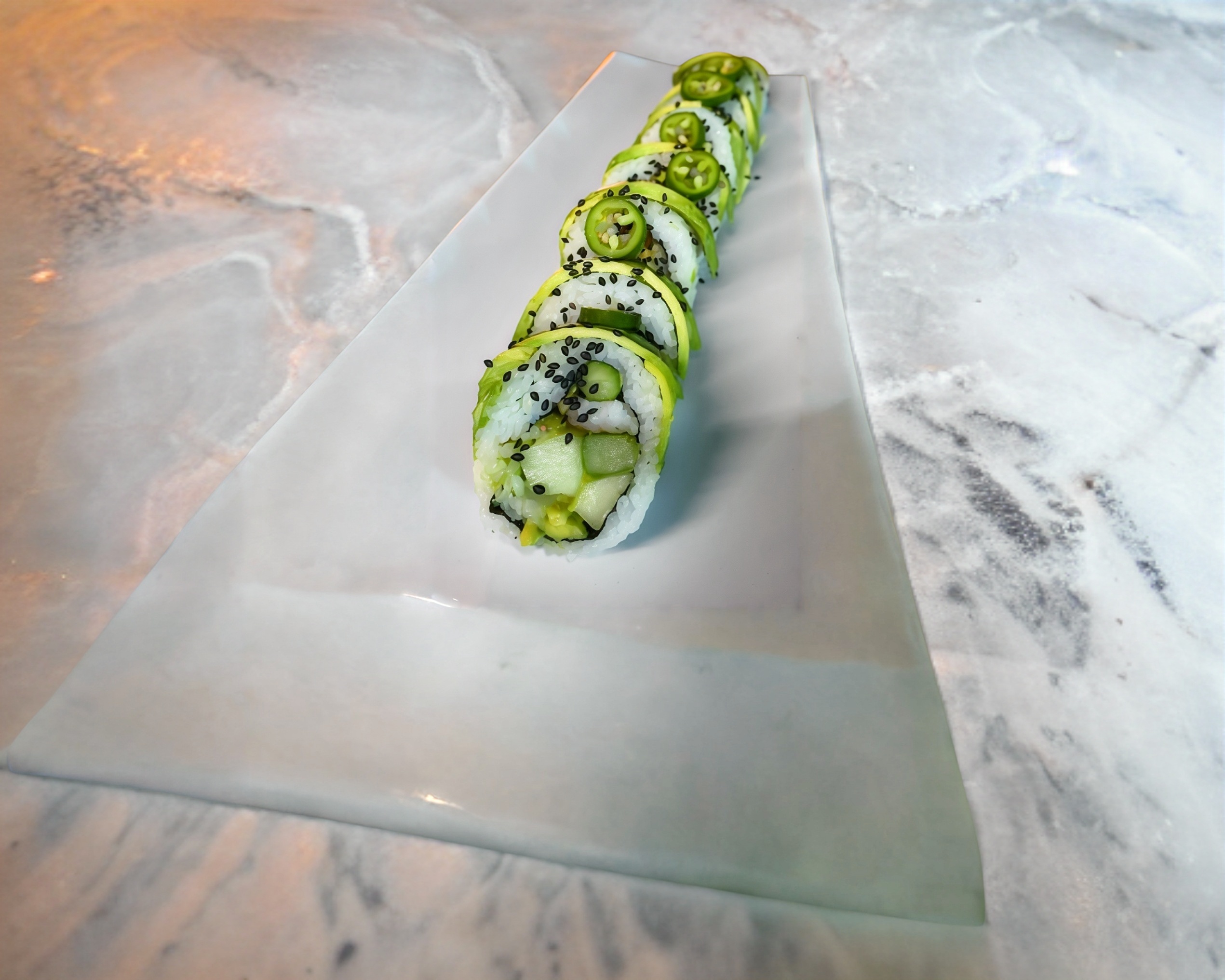 Aguacate, pepino, philadelphia, con cobertura de láminas de atún y ajonjolí.