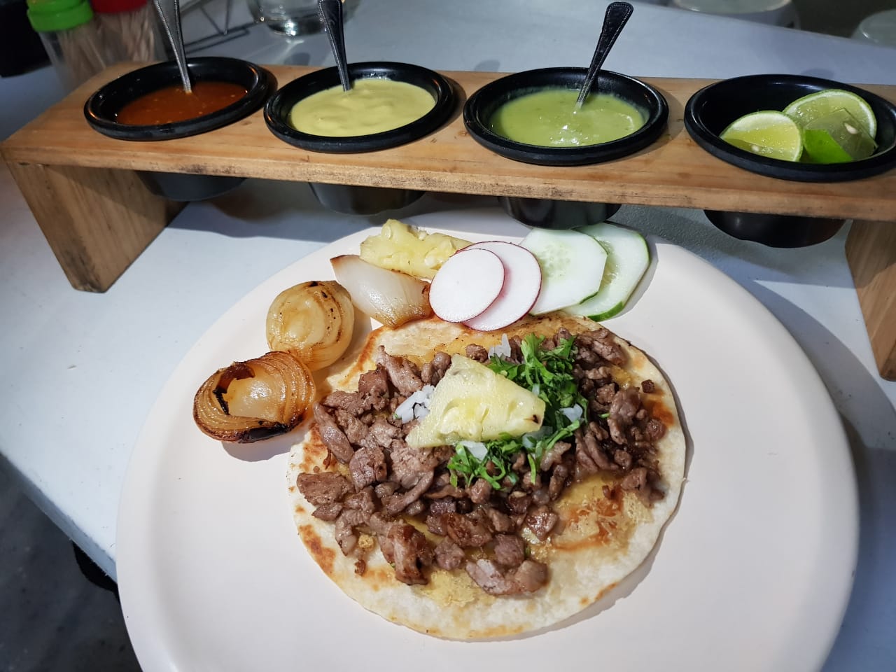 1 Taco de maíz, lleva cilantro, cebolla blanca, carne al pastor, 40 gramos aproximadamente, salsa suave y sin picante.