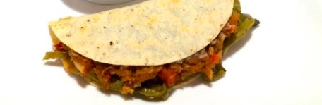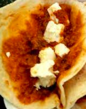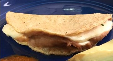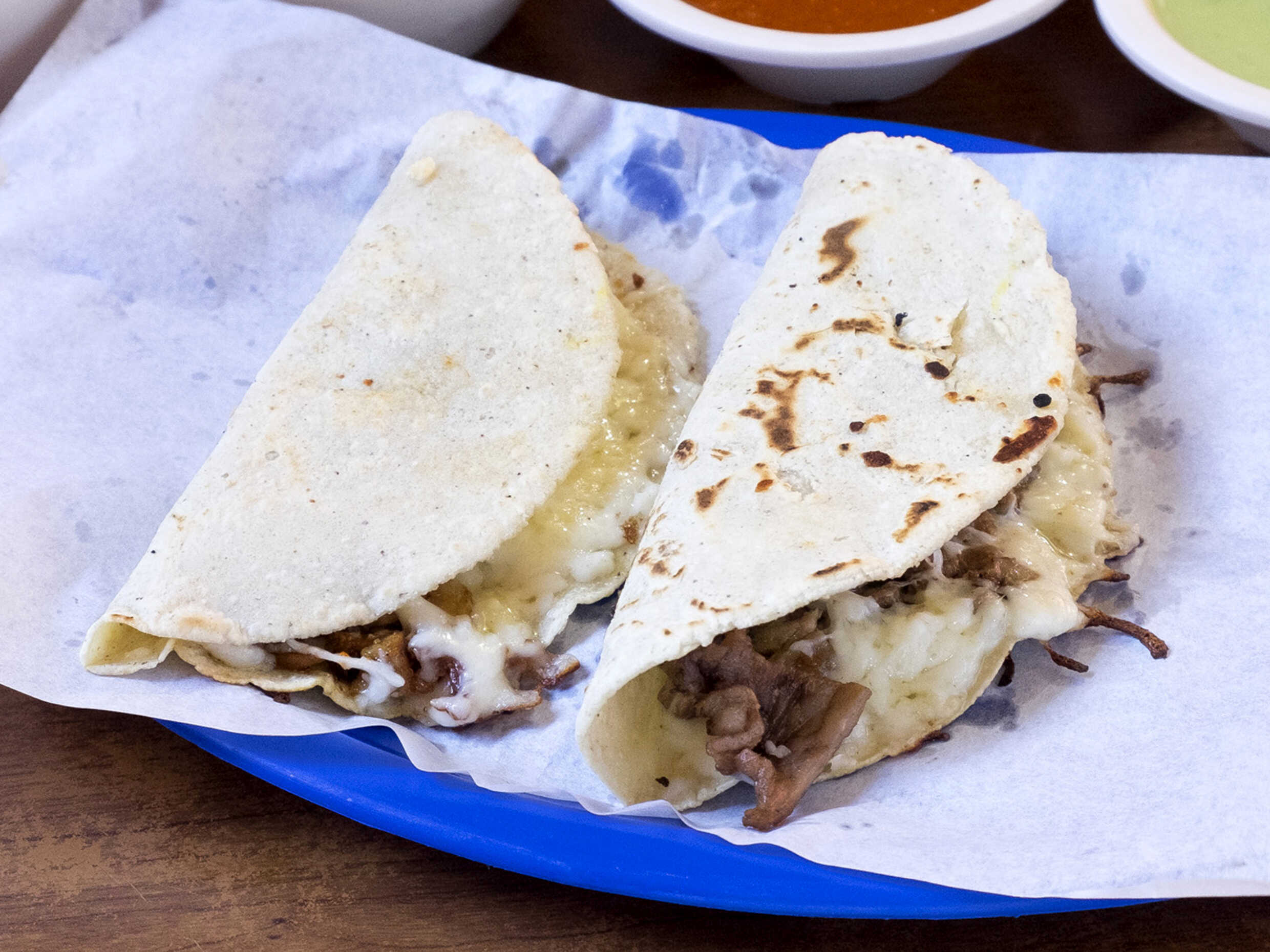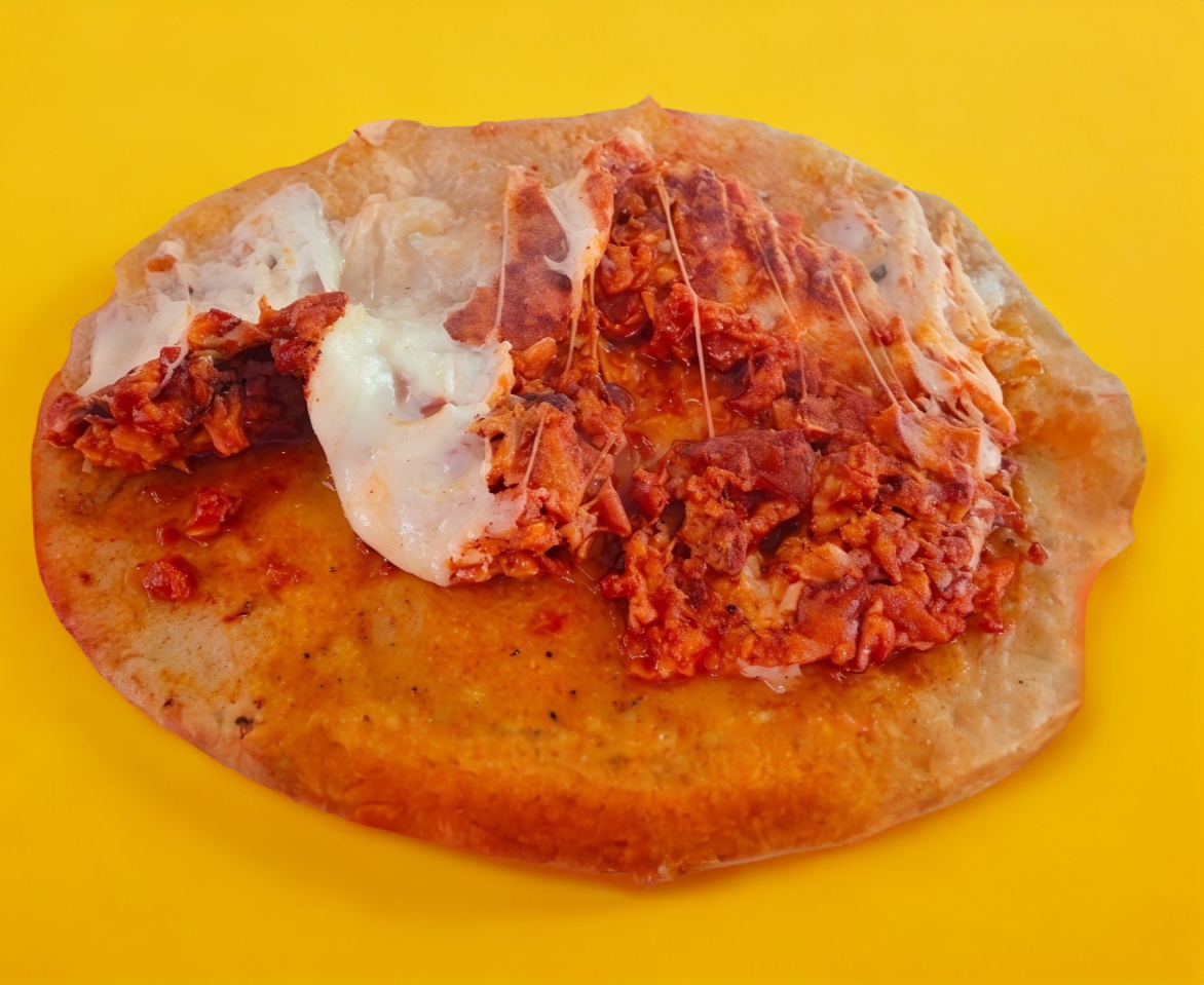 Tortilla hecha a mano con queso gratinado y carne al gusto.