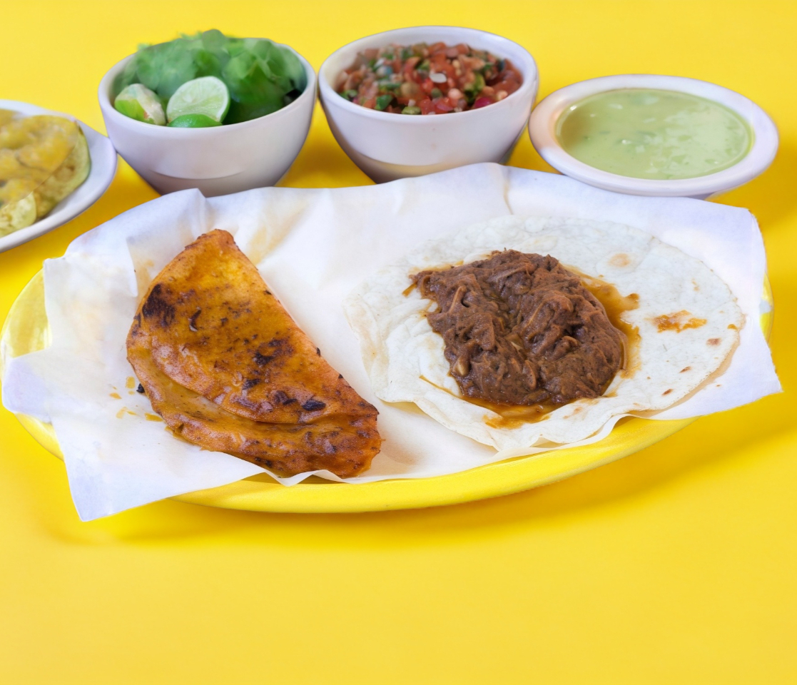 El alma de la birria en una tortilla: maíz hecho a mano, birria suavecita y queso derretido en un abrazo perfecto. ¡Una explosión de sabor que no podrás olvidar!