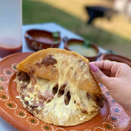 Quesadilla de Harina con Carne al pastor y queso, cebolla, cilantro, col, y frijolitos.