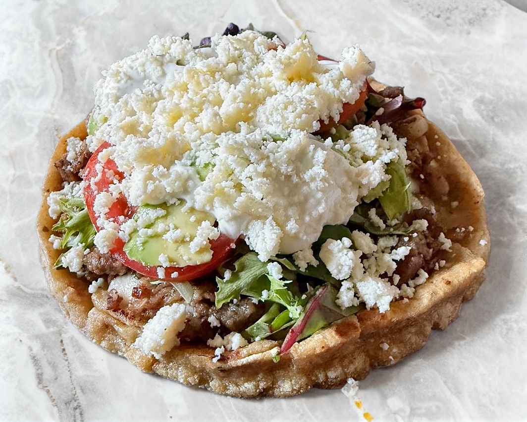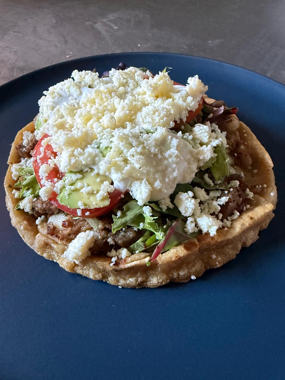 Sope preparado de adobada. Acompañado de lechuga, jitomate, cebolla, cilantro, crema, queso, aguacate y queso gratinado.