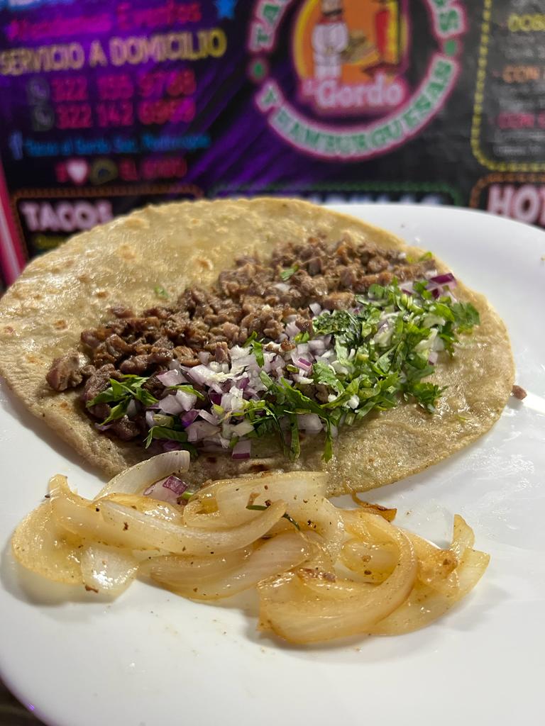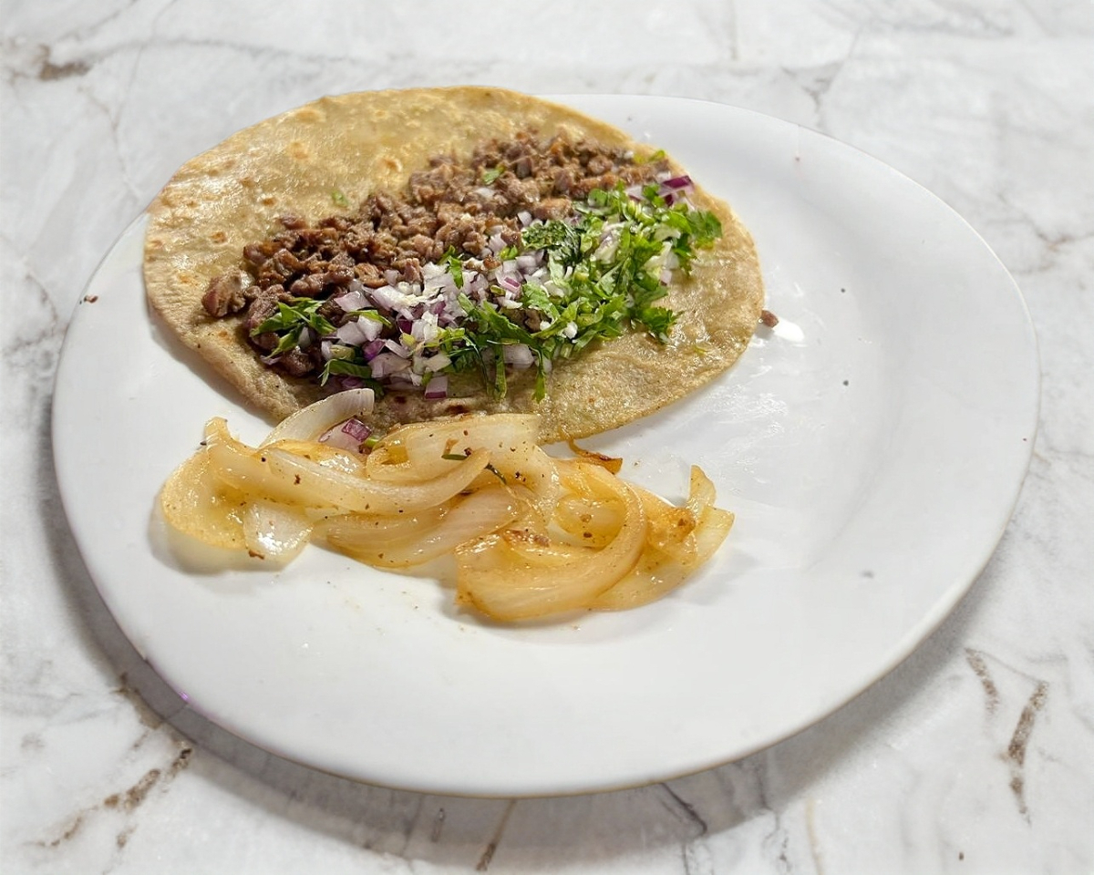 Riquísimo taco con tortilla hecha a mano de Asada, Pastor y Chorizo con cilantro y cebolla. Puedes acompañarlo con limón y una salsita bien rica