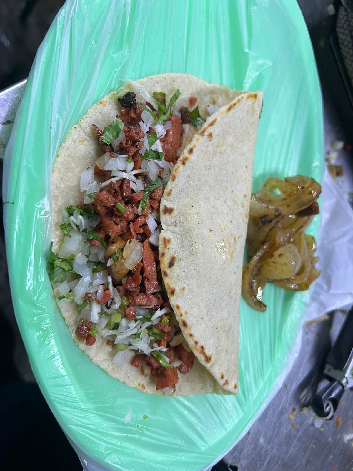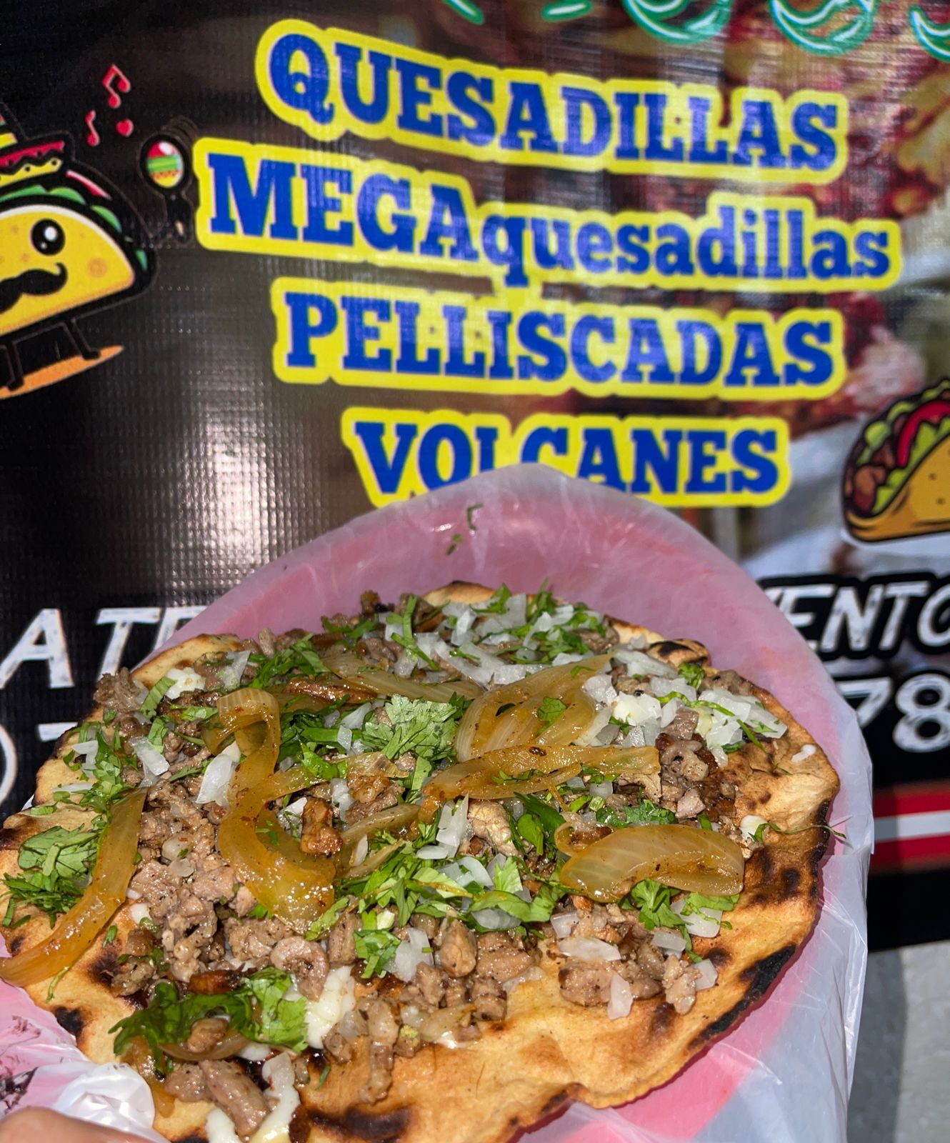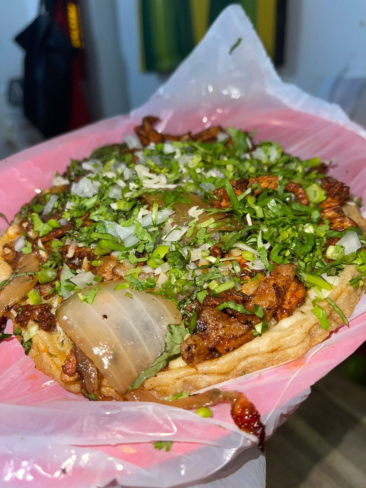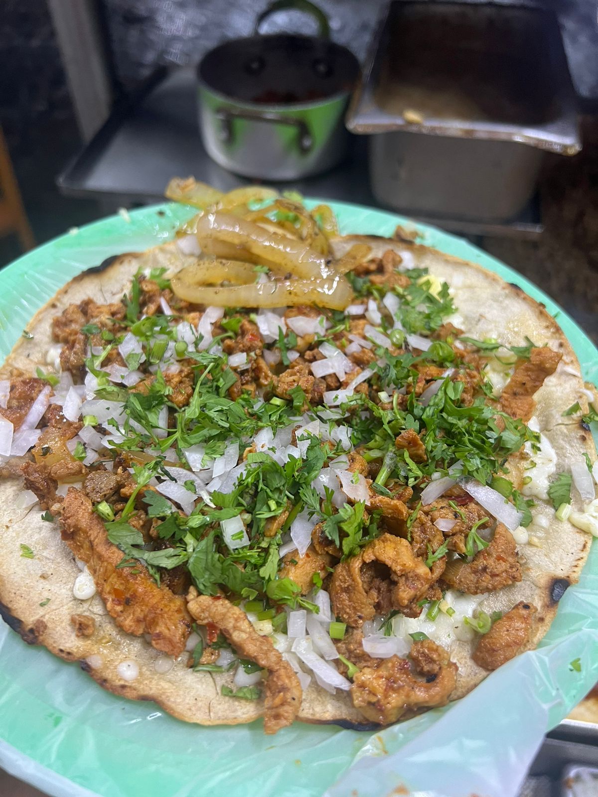 carne al pastor,queso,cilantro,cebolla y cebolla quisada