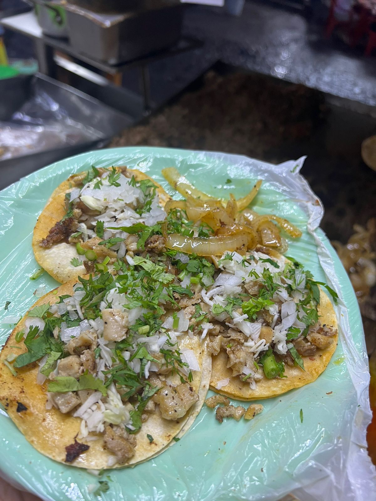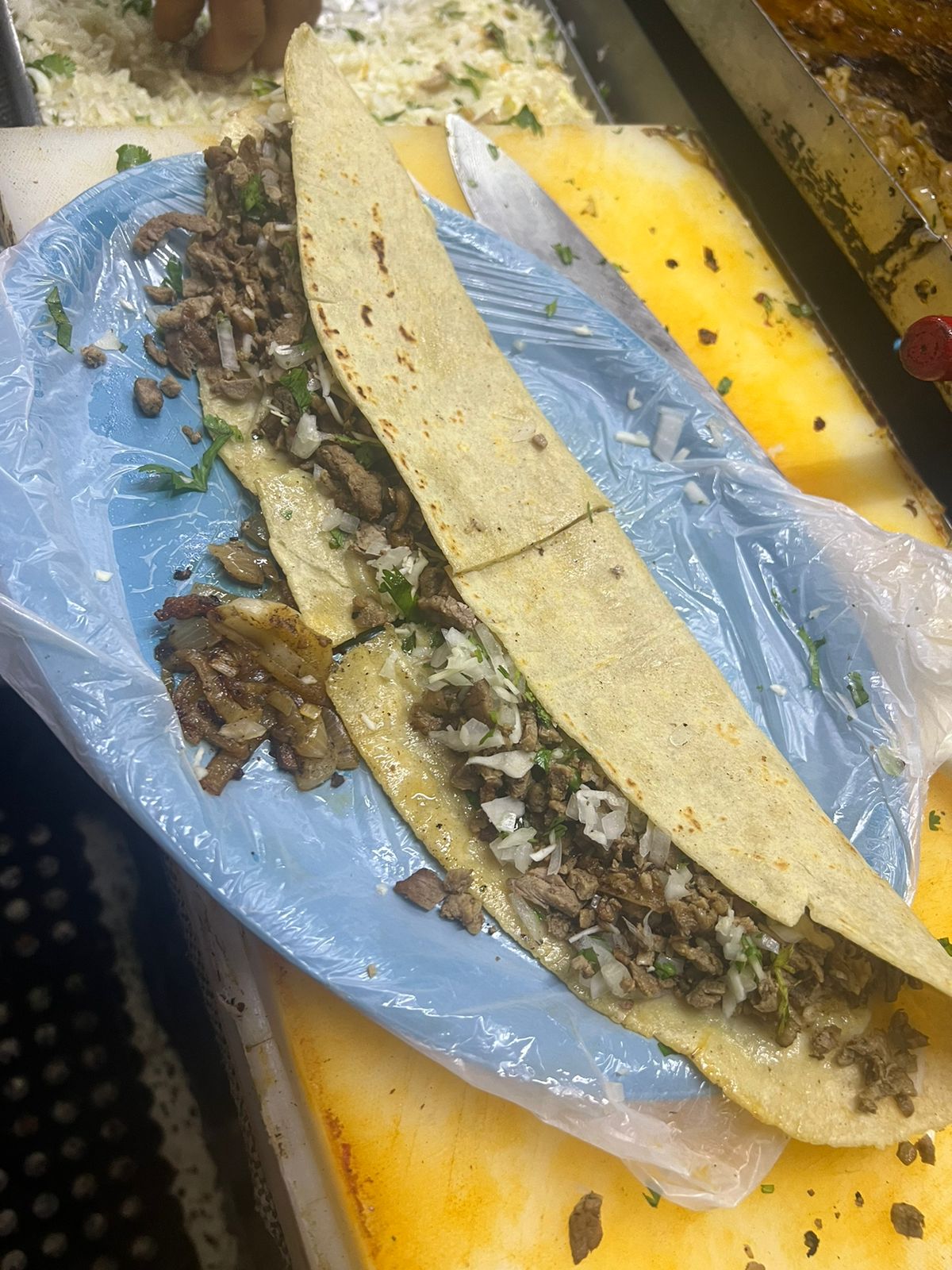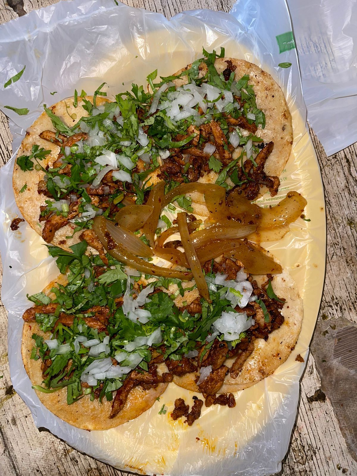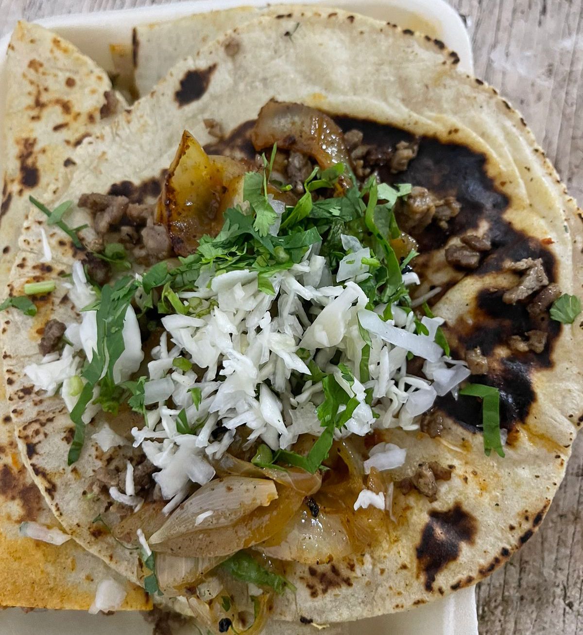 carne al pastor,queso,cilantro,cebolla y cebolla quisada