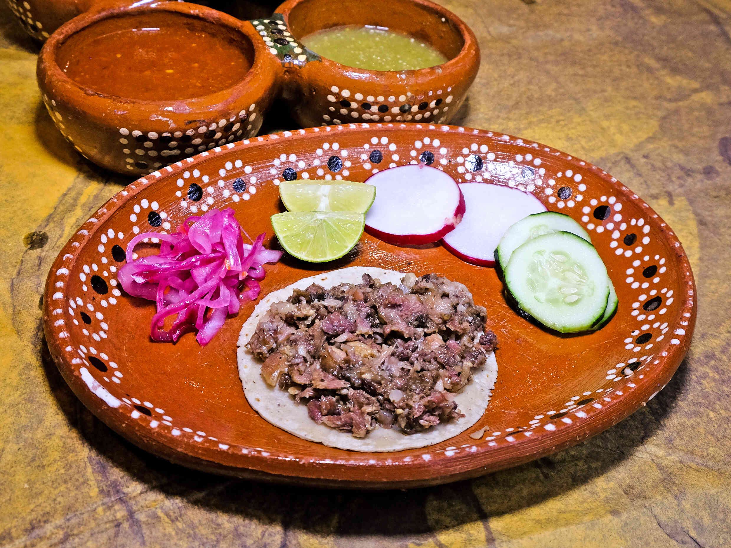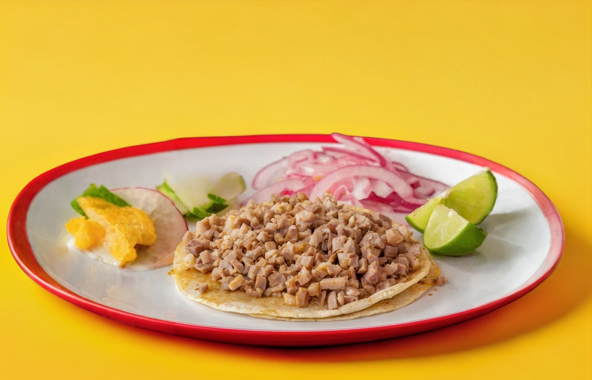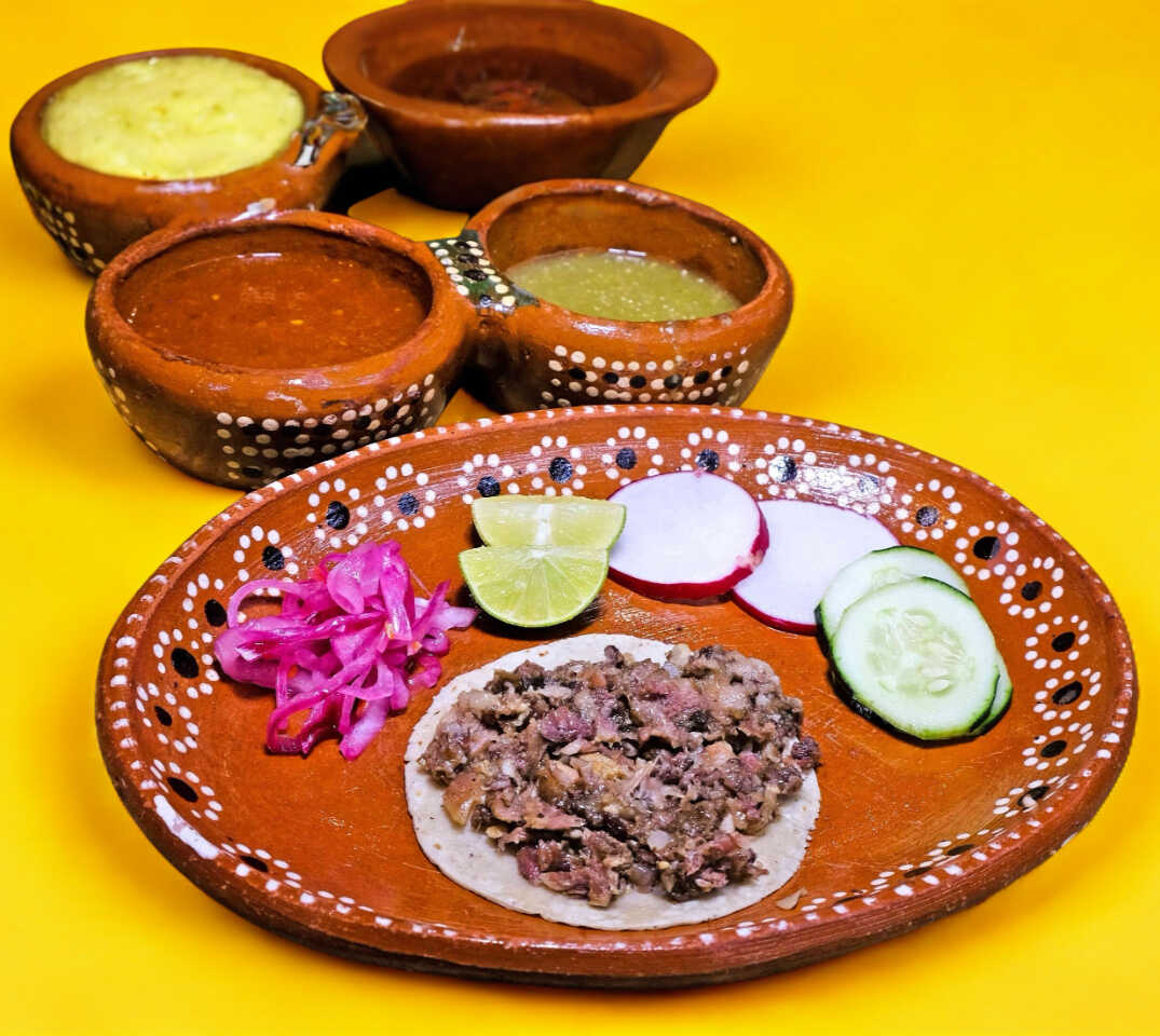1 Taco de cecina, con cebolla y cilantro; salsas por aparte.