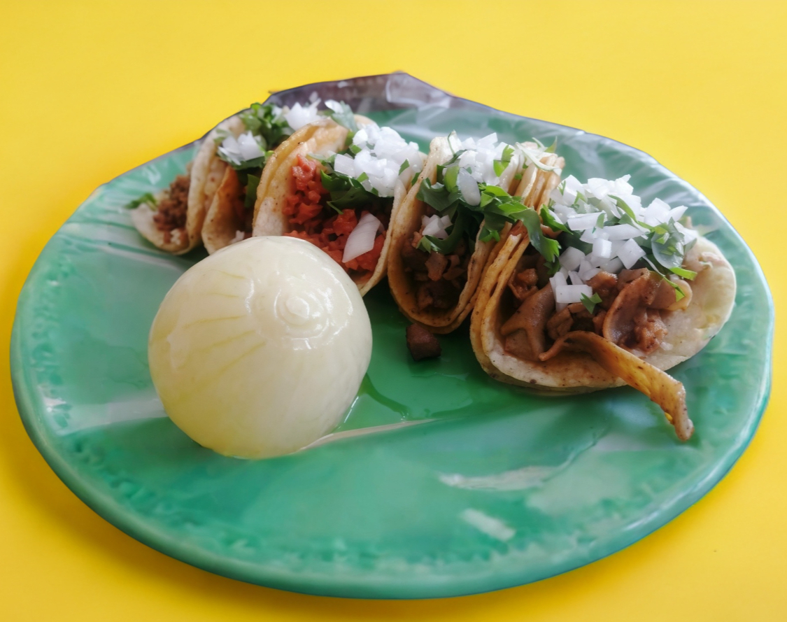 Taco de Carnaza con cebolla y cilantro; salsas por aparte.