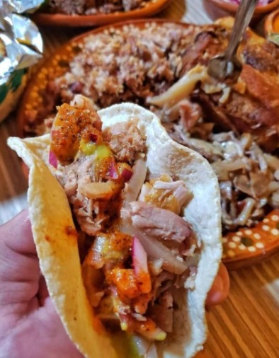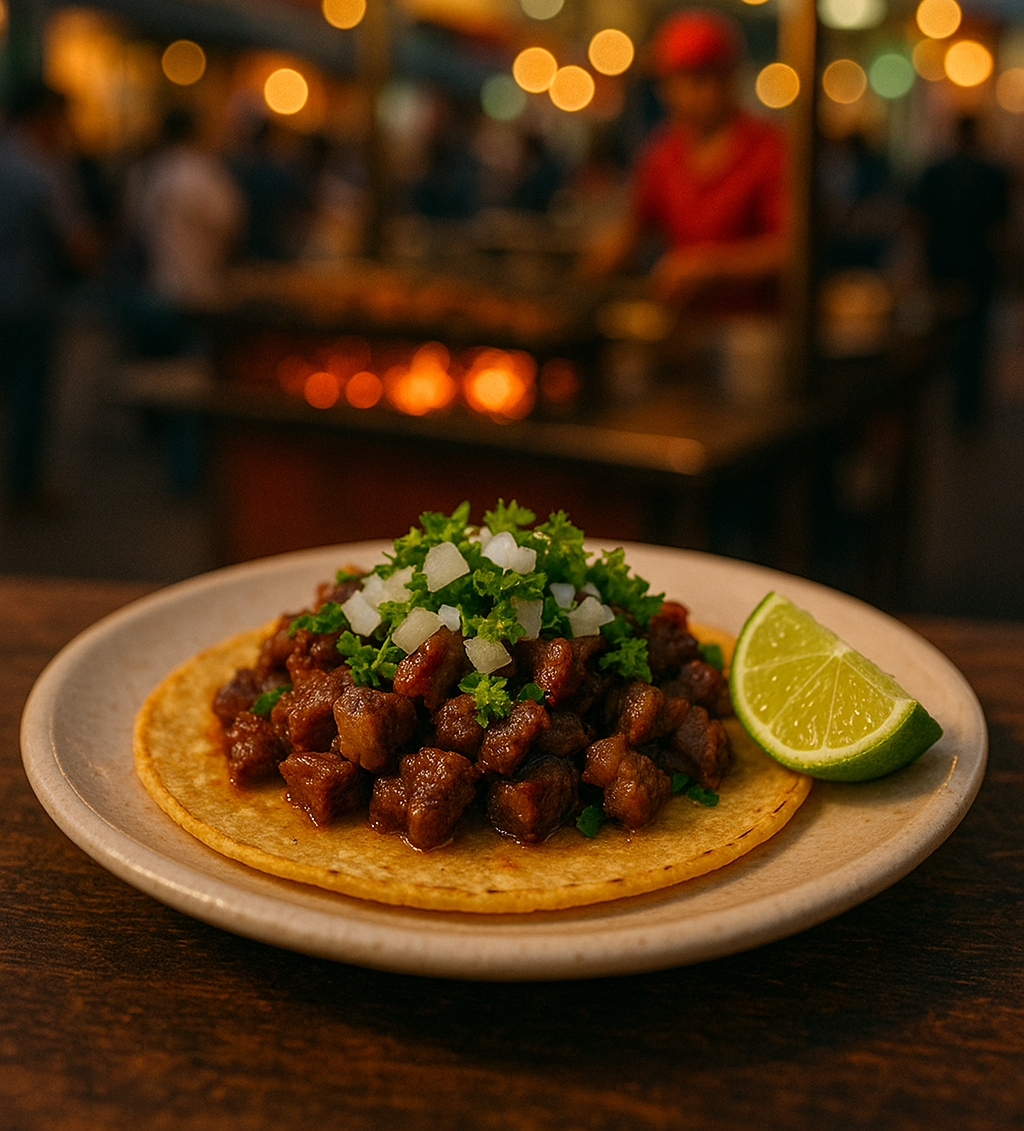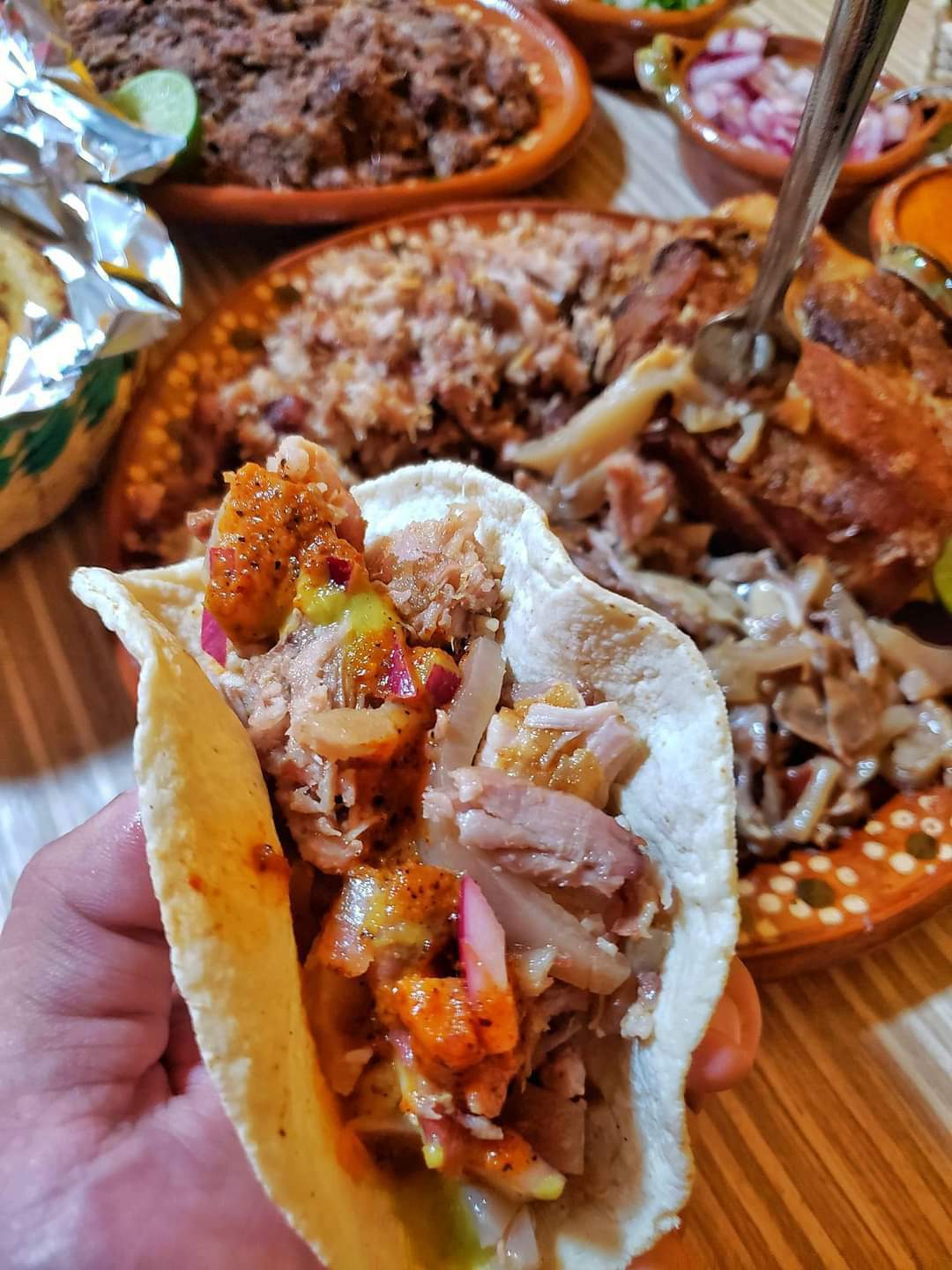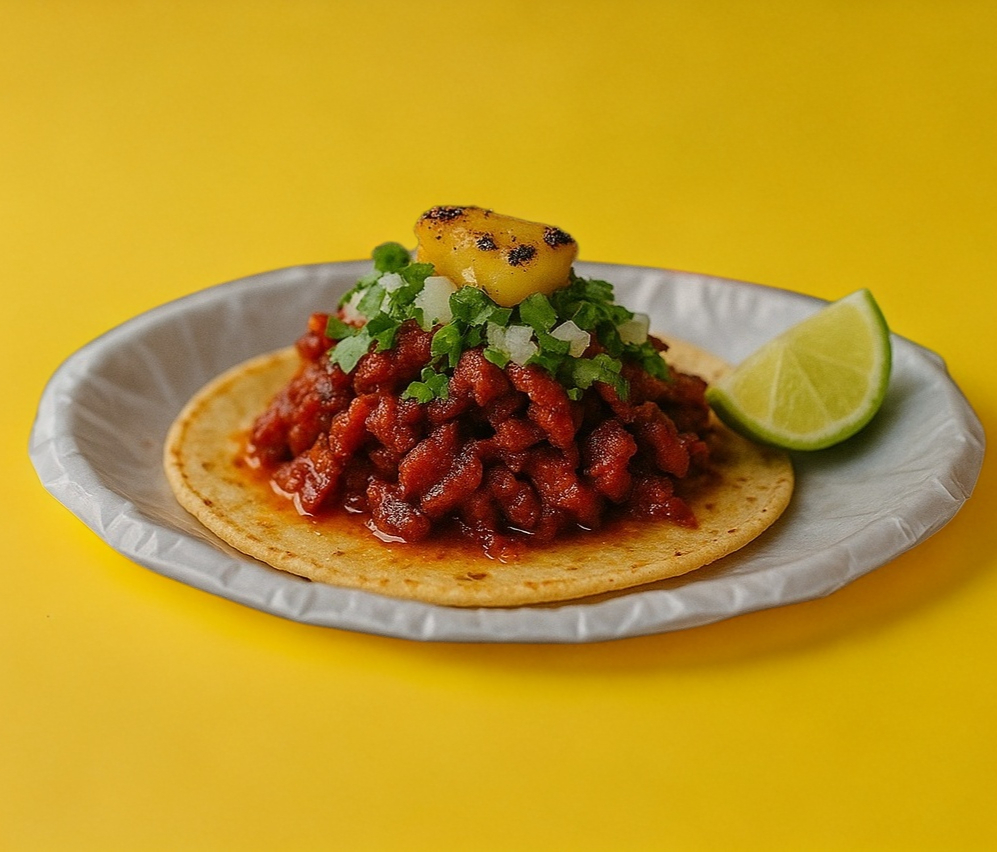 Te lo servimos en una tortilla chiquita, de esas que agarras con dos dedos porque está bien calientita🔥. El pastor, recién cortado del trompo, todavía chisporrotea, con ese adobo rojo que huele a gloria🤤. Le ponemos cebolla y cilantro sin preguntarte, y un pedazo de piña chamuscada que sabe riquísima🤪. Agregamos limoncito, medio seco pero efectivo además de salsas que nunca has probado