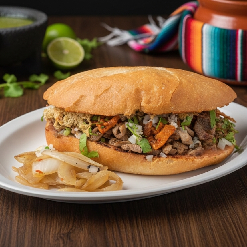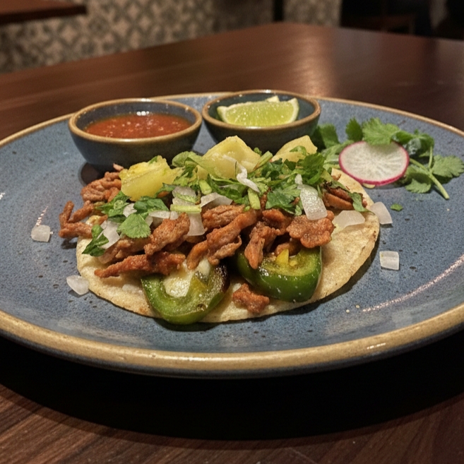 pastor,queso gratinado gouda,cilantro,cebolla,guacamole y salsa taquera