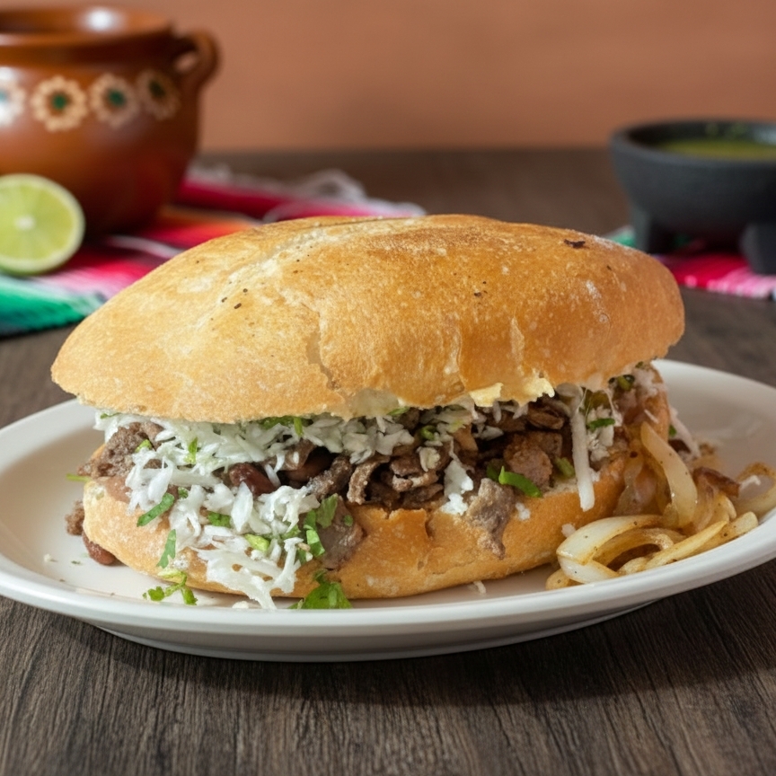asada,queso gratinado gouda,col,cilantro,cebolla,salsa de guacamole y salsa taquera.