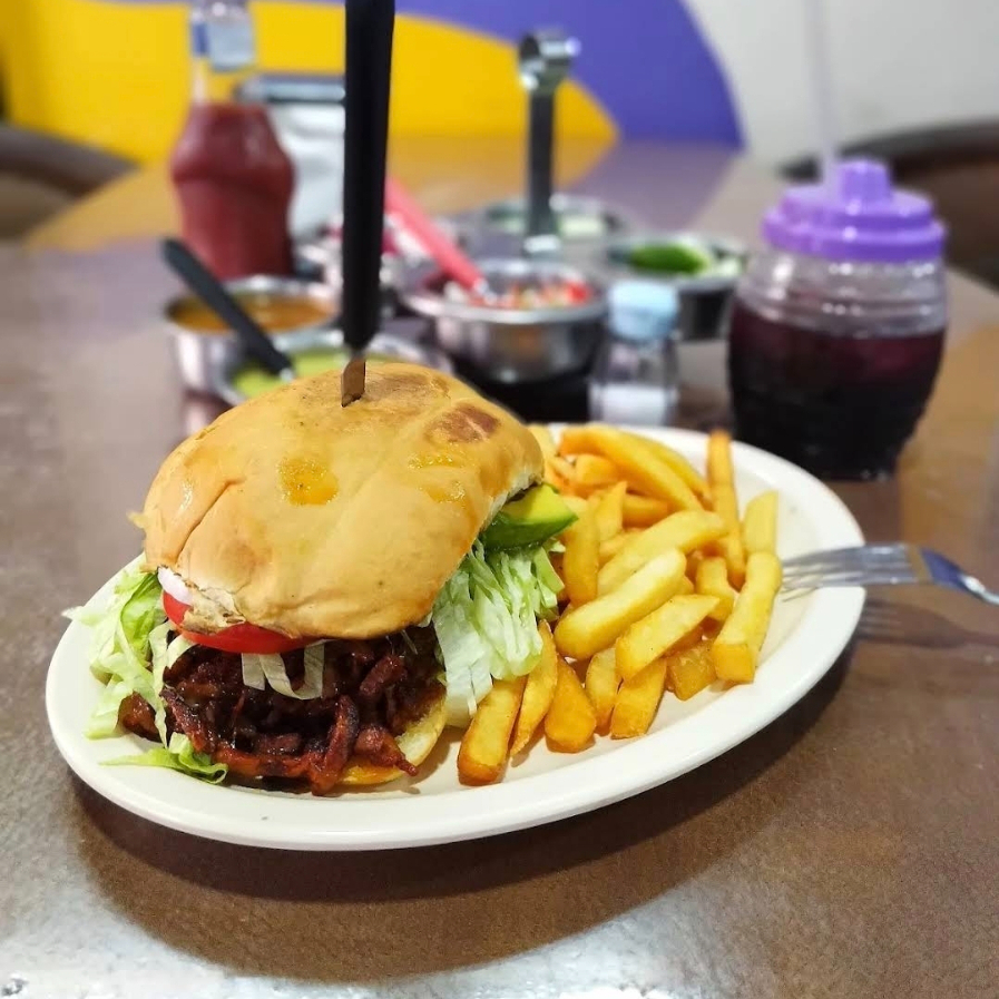 Torta de pastor acompañada con papas a la francesa, incluye lechuga, jitomate, cebolla y queso