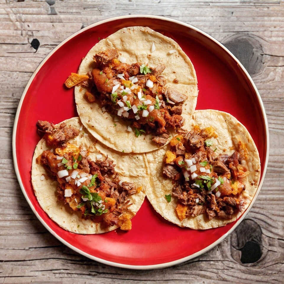 Taco de bistec preparada con ajo, cebolla y jitomate.
