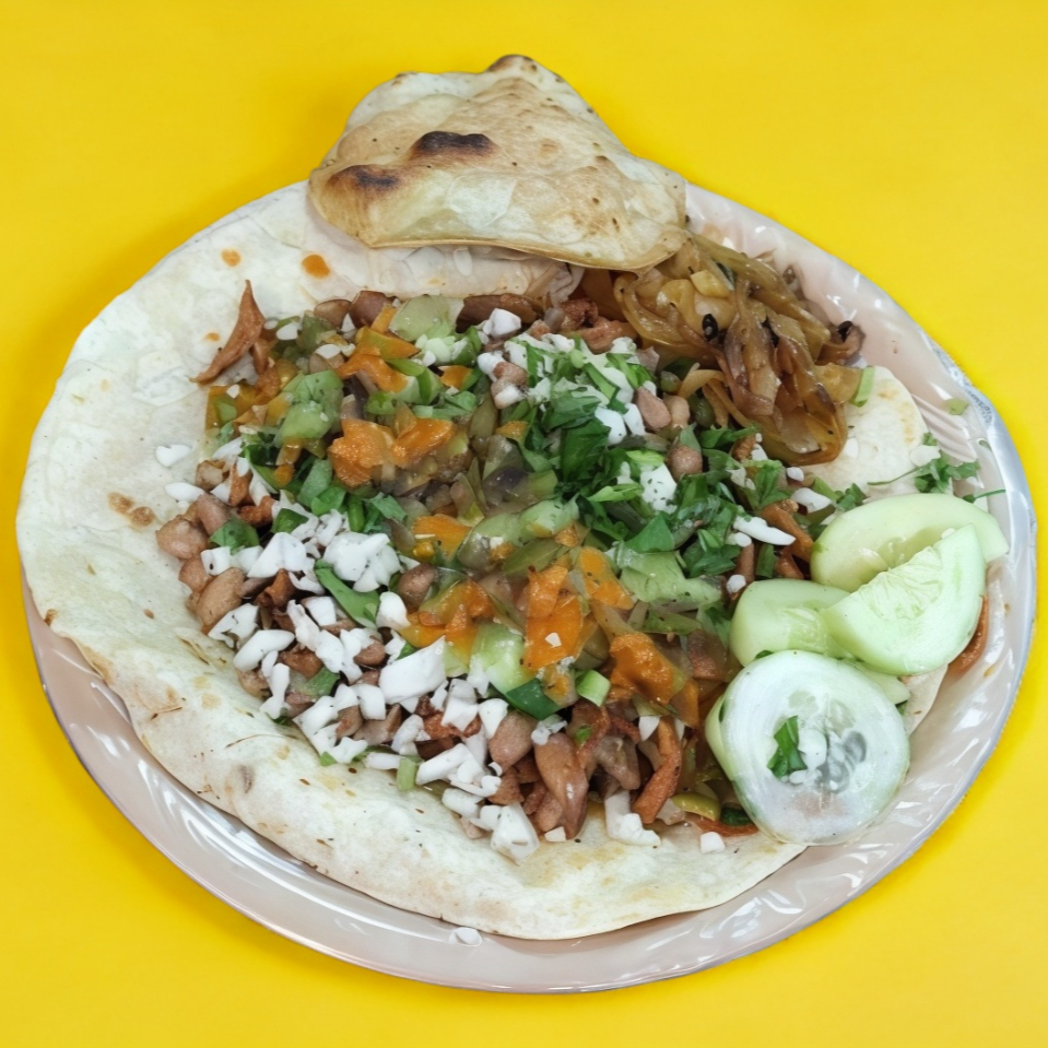 Tortilla grande de harina con queso y carne de res, pastor acompañada de piña y verdura.