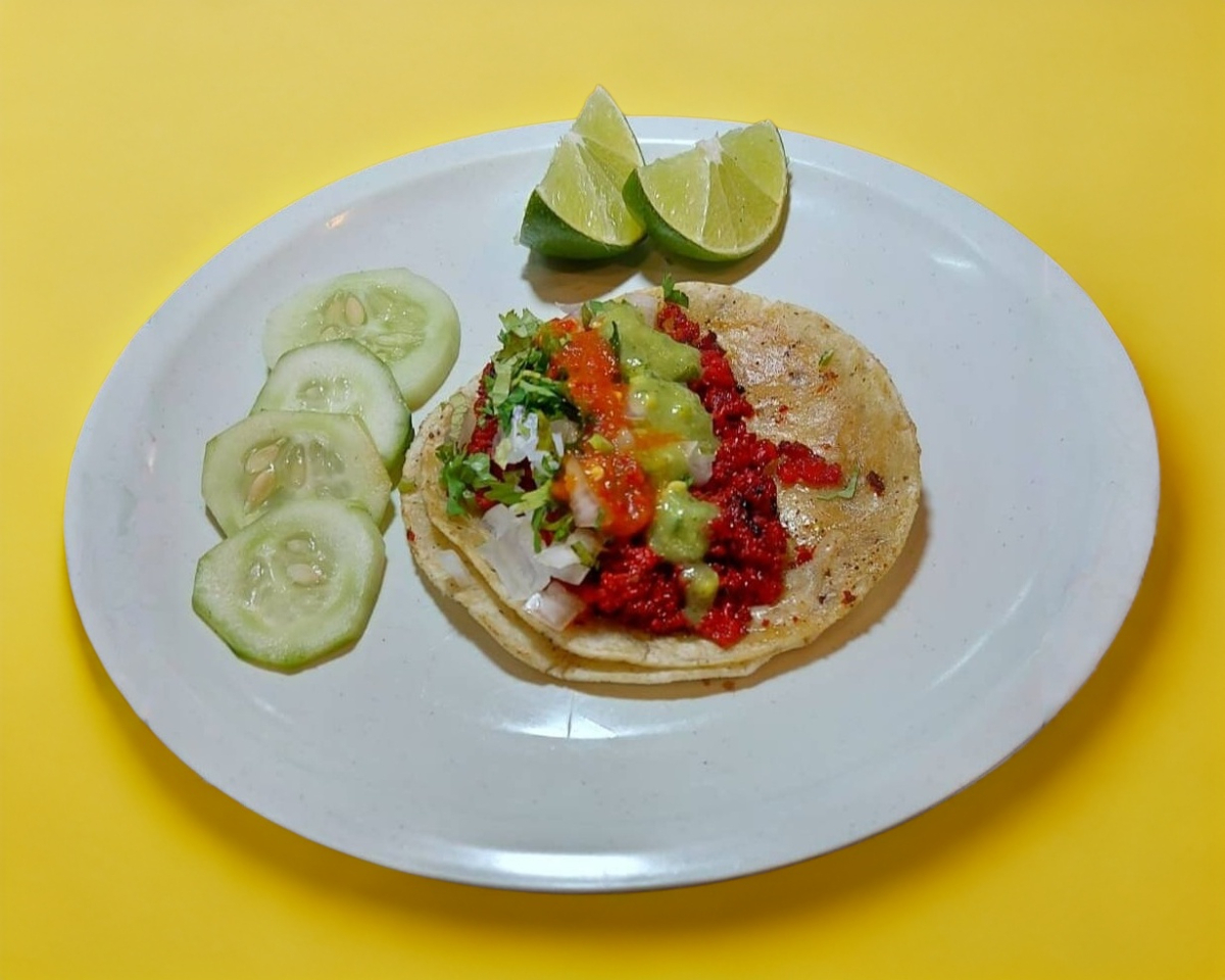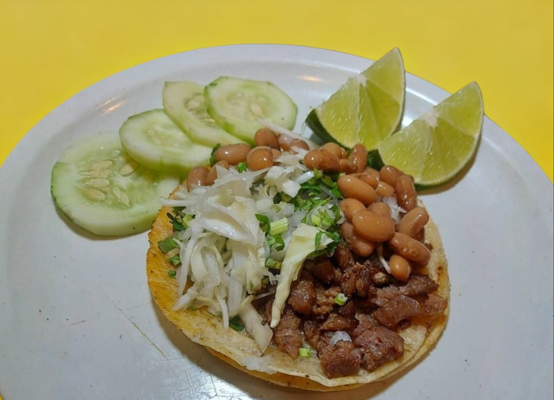 Tacos de carne asada de res con cebolla, cilantro, col y frijolitos.