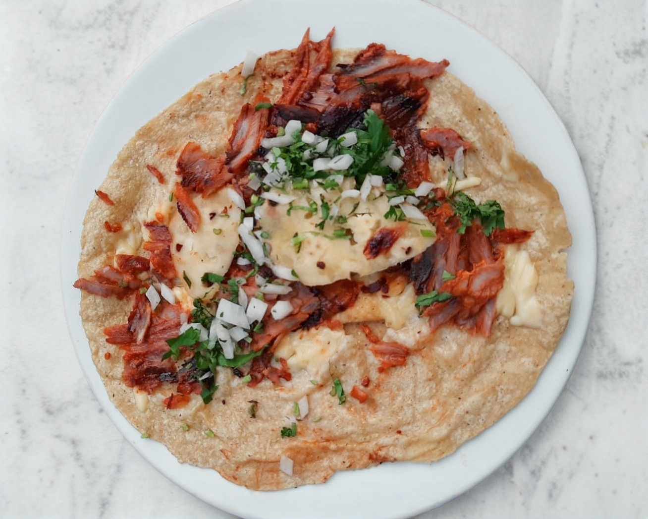 Quesadilla grande con solo pastor nopalitos, cebolla y cilantro.