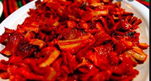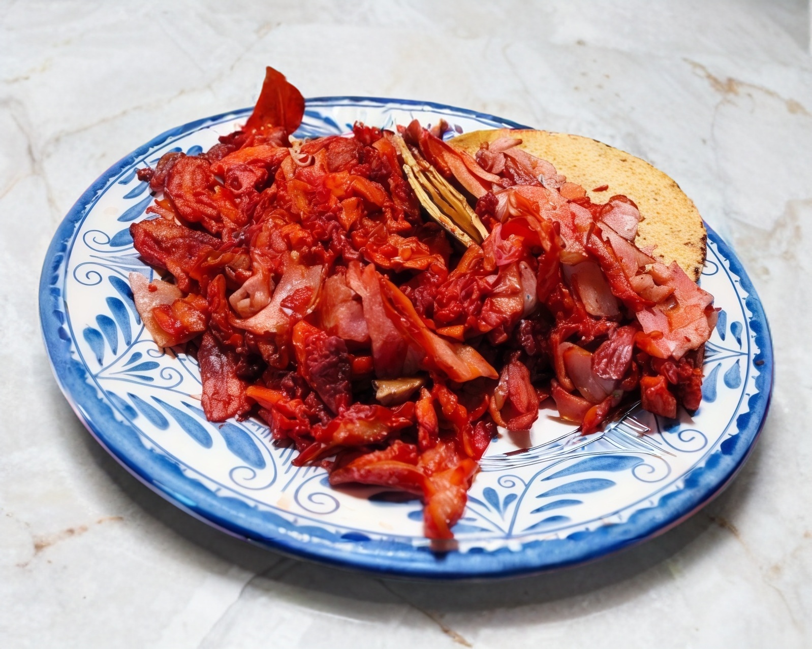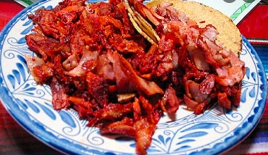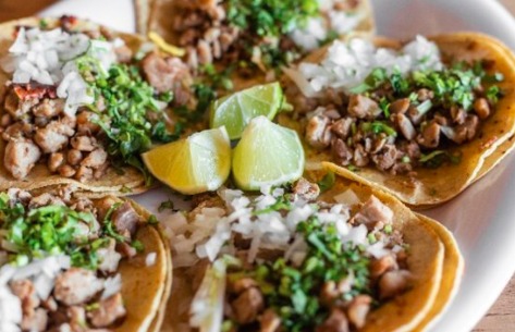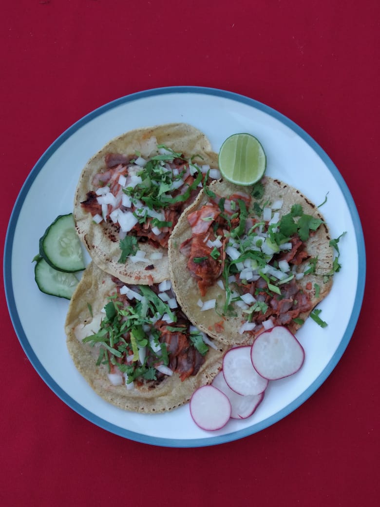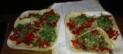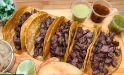 Bistec de res picado, cosinado a la plancha con queso de gratinado. Porcioncomo de 10 tacos salsas verdura.