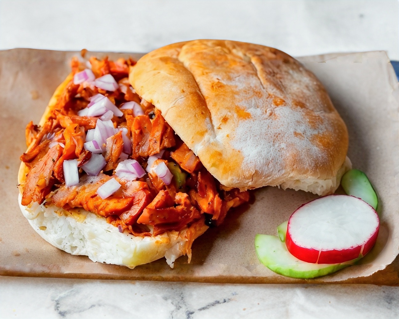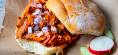 Torta con Pastor. Cebolla, cilantro, carne al pastor (80 gramos ), mayonesa y queso gouda con oaxaca. suero y guacamole