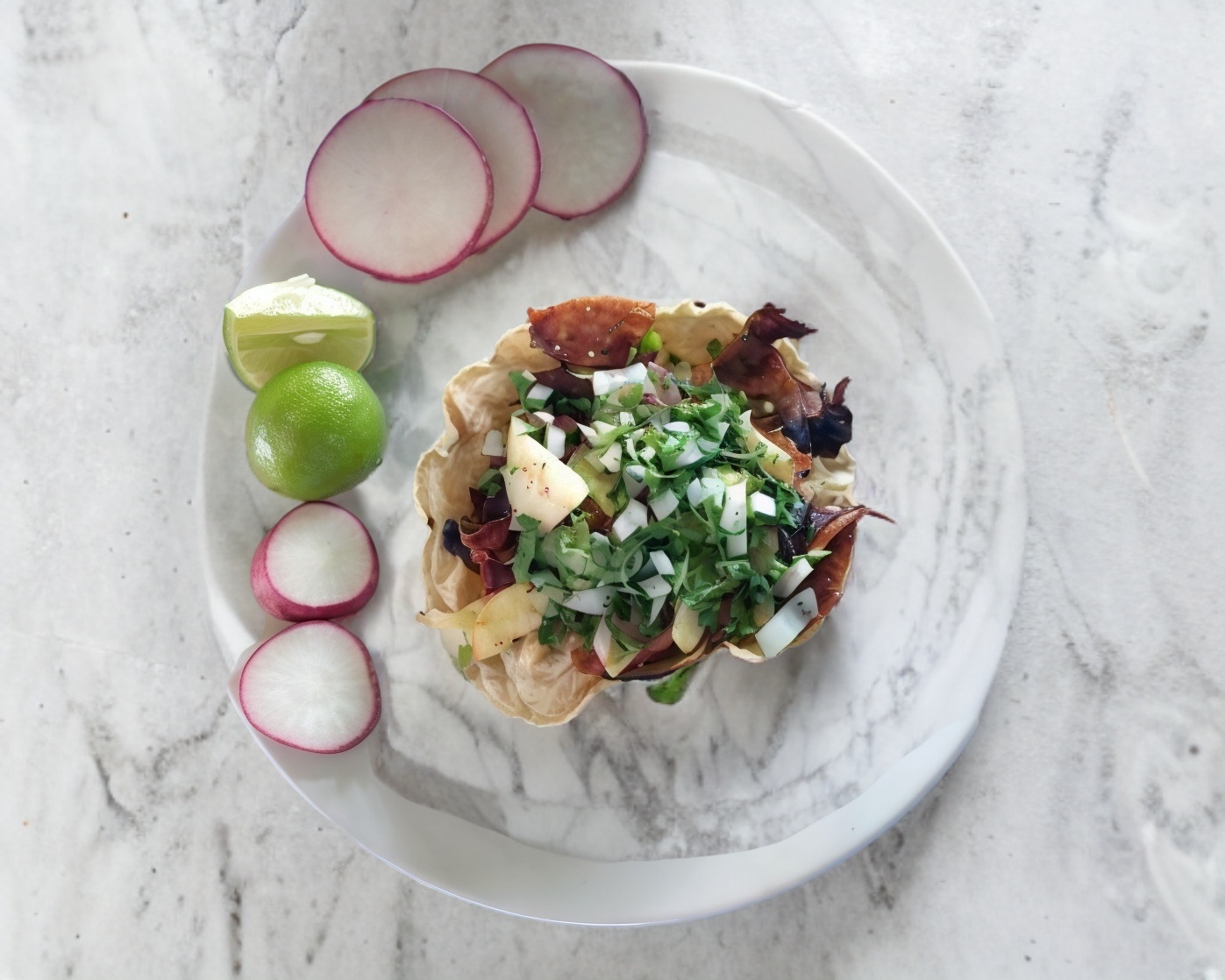 Cebolla, cilantro, verduras, salsa y tortillas.