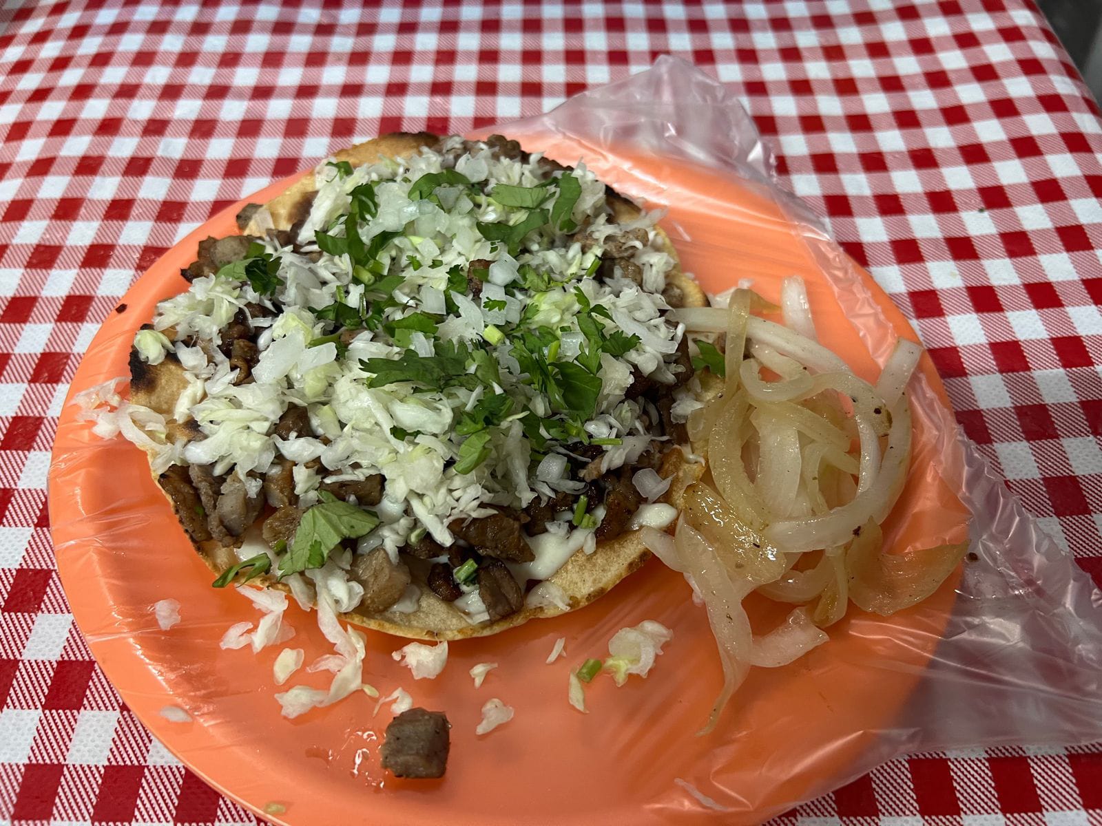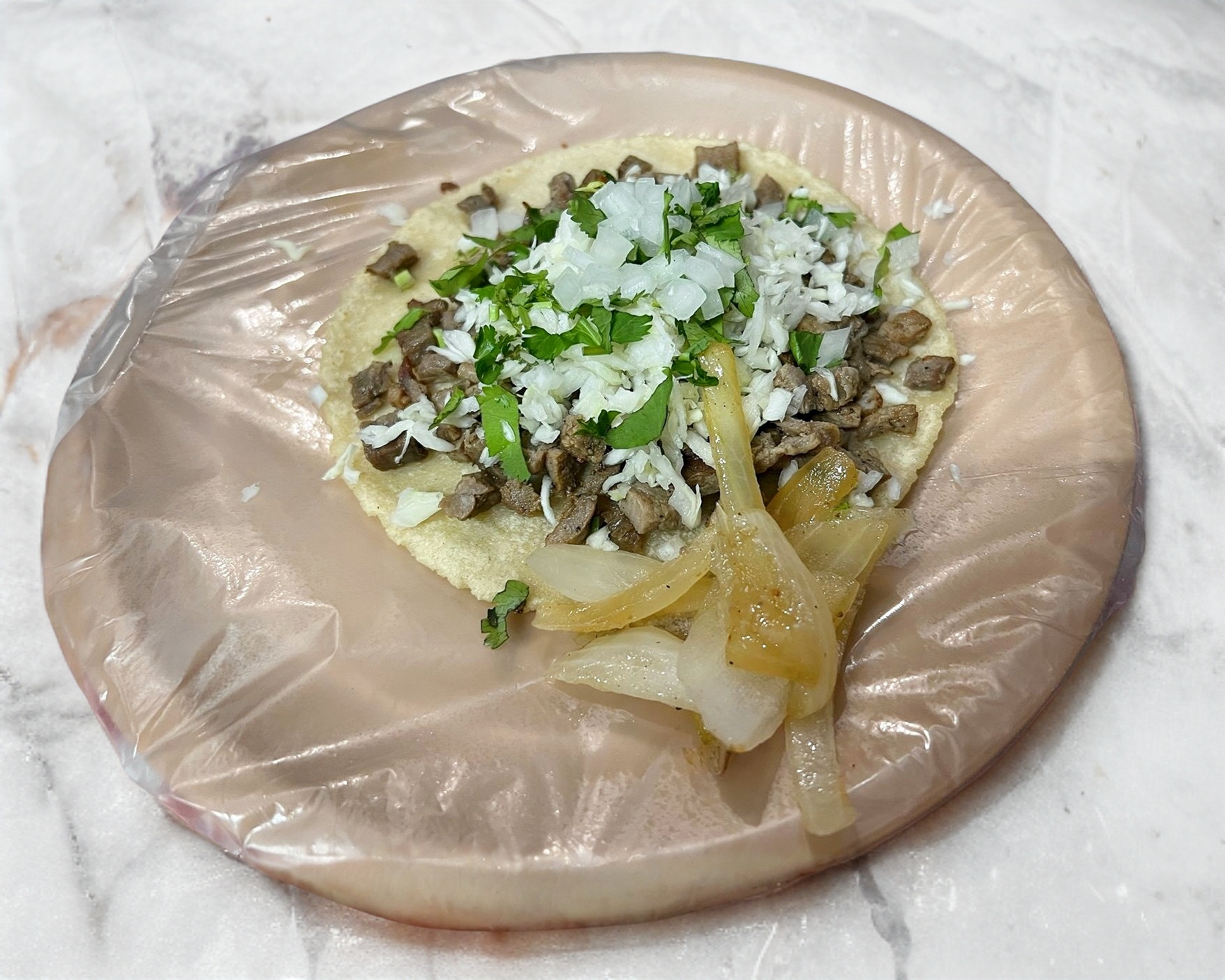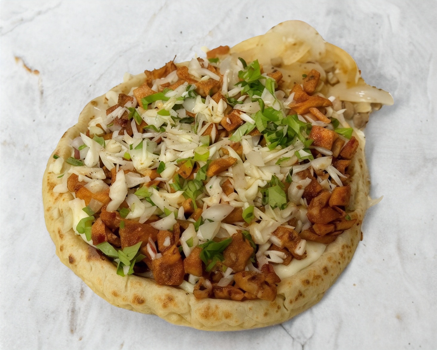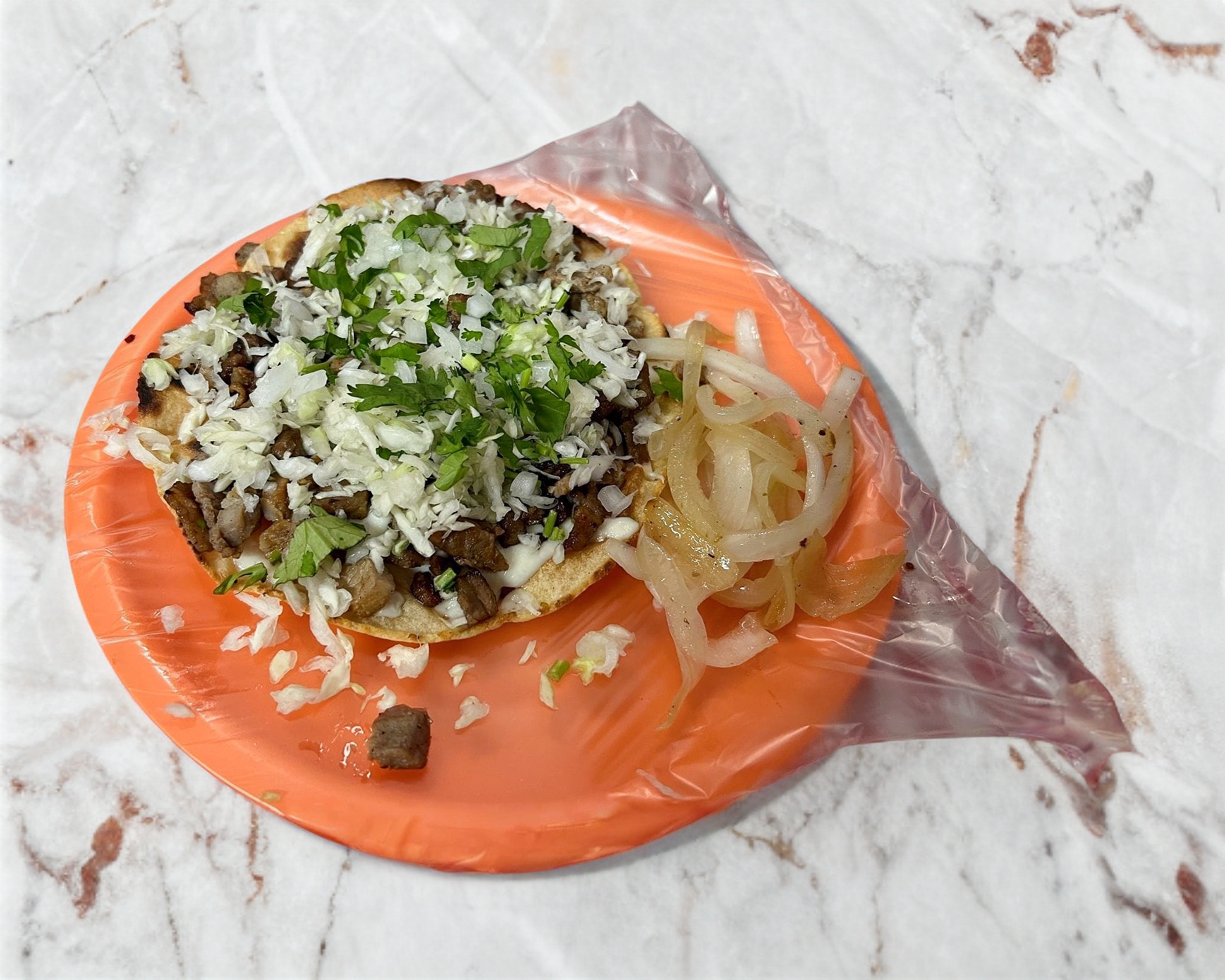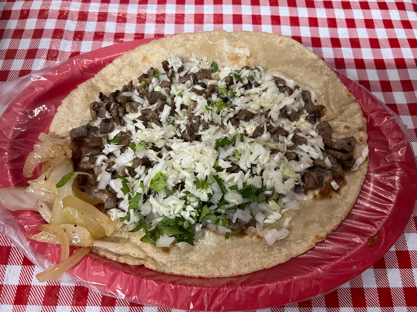Tortilla hecha a mano doradita con queso, carne asada y verdura: repollo, cilantro y cebolla. Incluye cebollita asada.