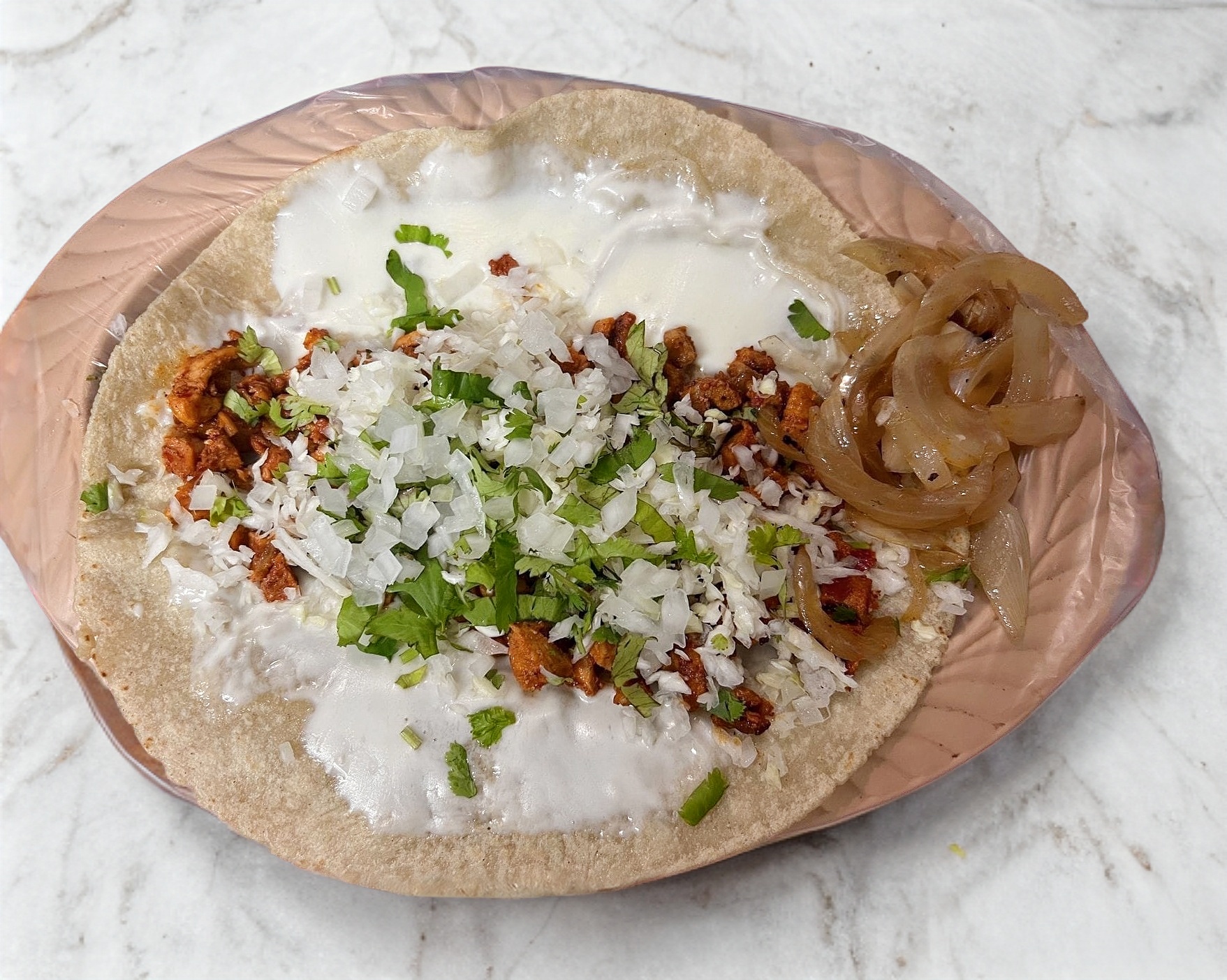 Tortilla hecha a mano con queso, carne adobada y verdura: repollo, cilantro y cebolla, incluye cebollita asada.