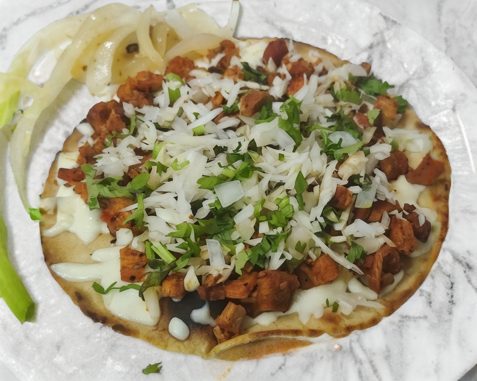 Tortilla hecha a mano doradita con queso, carne adobada y verdura: repollo, cilantro y cebolla. Incluye cebollita asada.