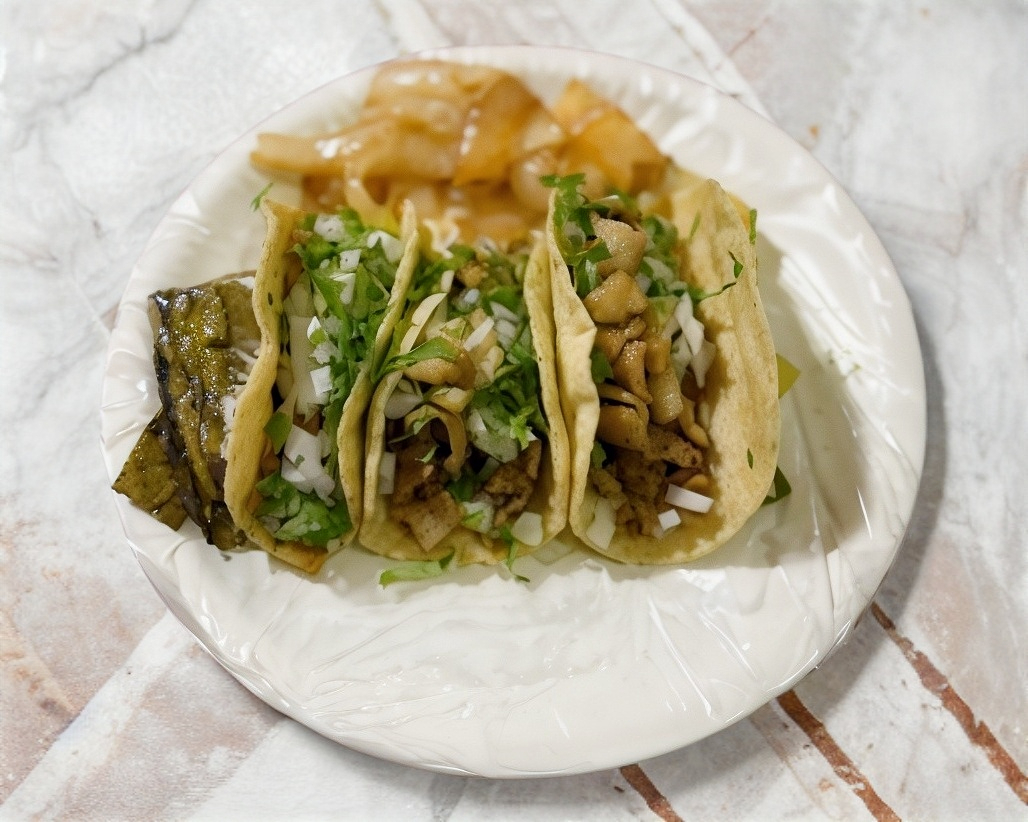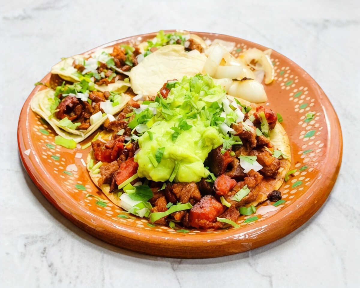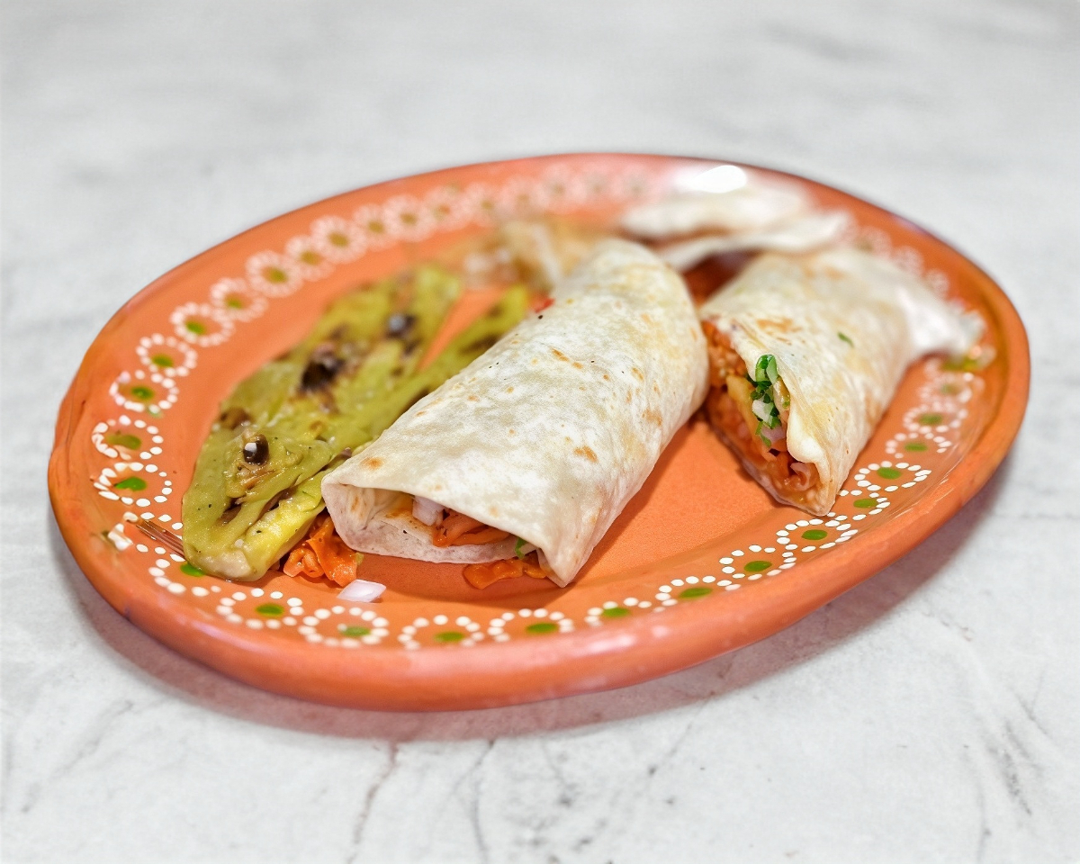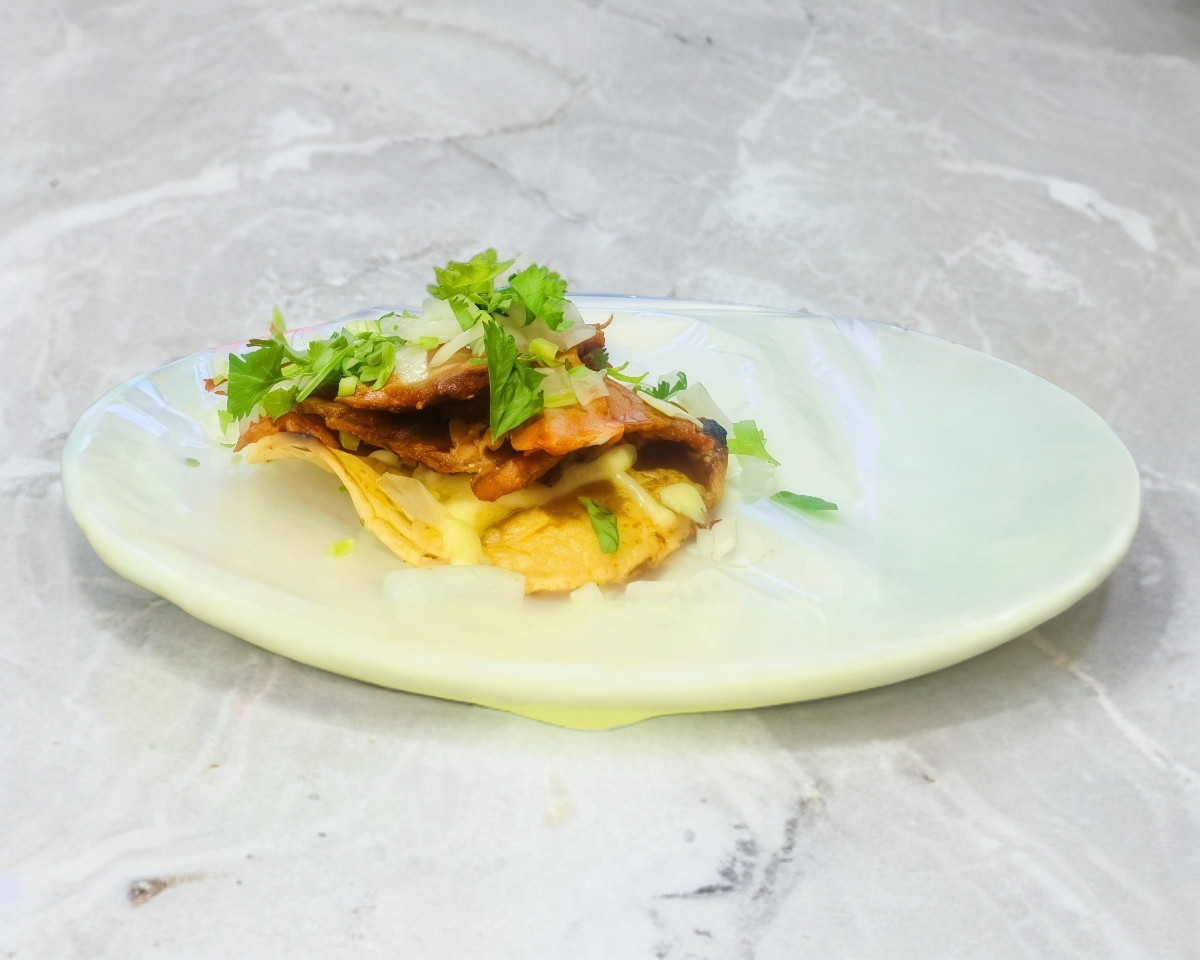 deliciosa tortilla de harina con una generosa porcion de queso gouda gratinado y carne al pastor acompañado de deliciosas salsas del dia