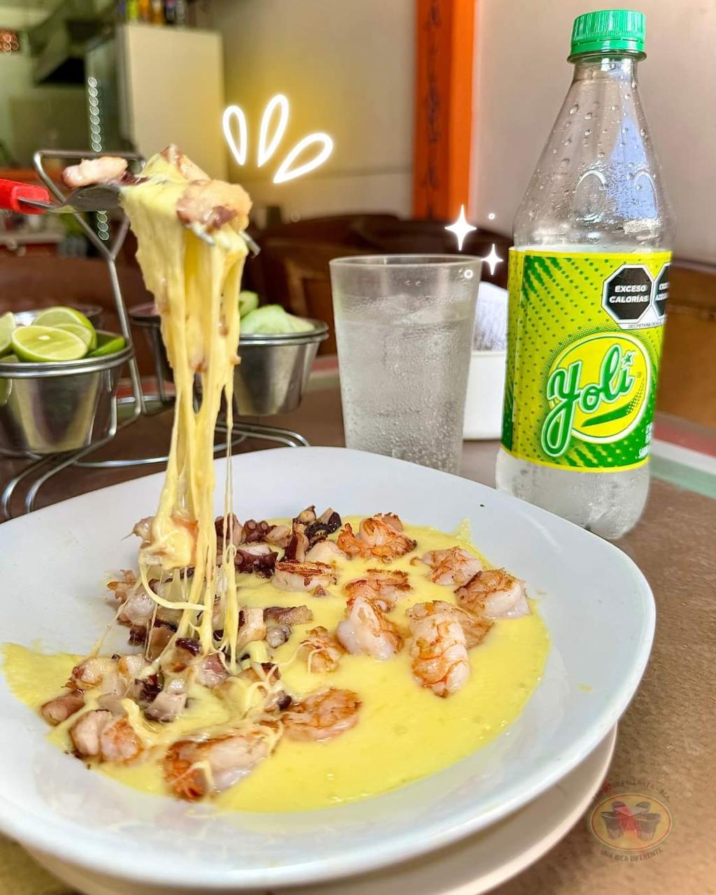 Queso gratinado con pastor y piña. Incluye tortillas