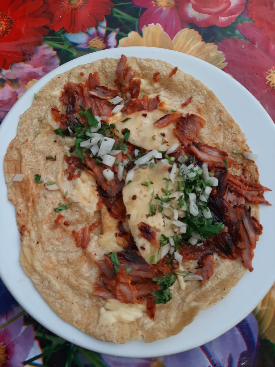 Tortilla , queso y carne cebolla y cilantro.