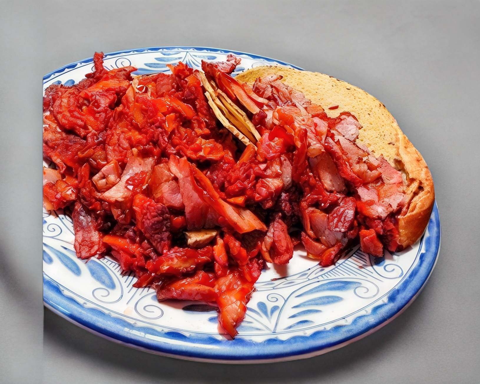 Morrón, cebolla, tocino, carne y tortillas.