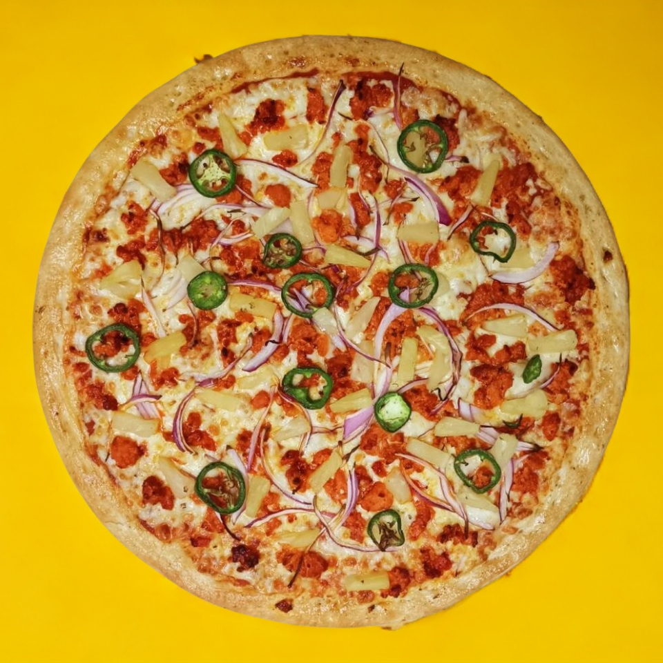 Pizza grande de pastor, con piña, jalapeño y cebolla morada