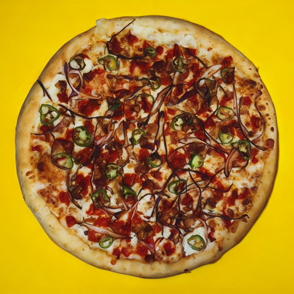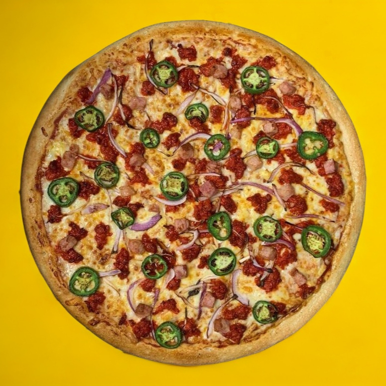 Pizza grande con cebolla, jalapeño, chorizo y tocino