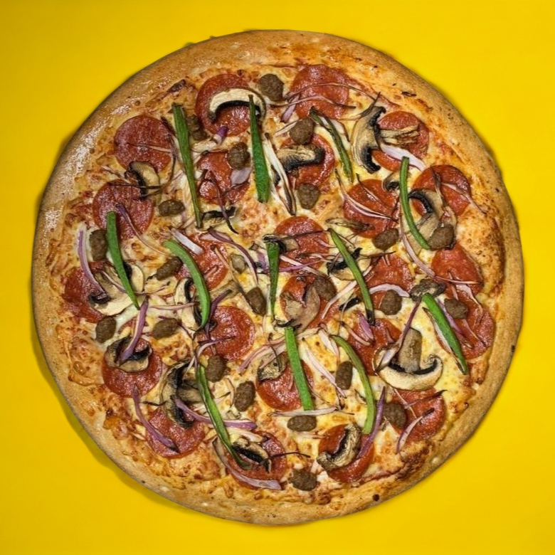 Pizza grande con una combinación de queso, 4 carnes, pepperoni y suprema