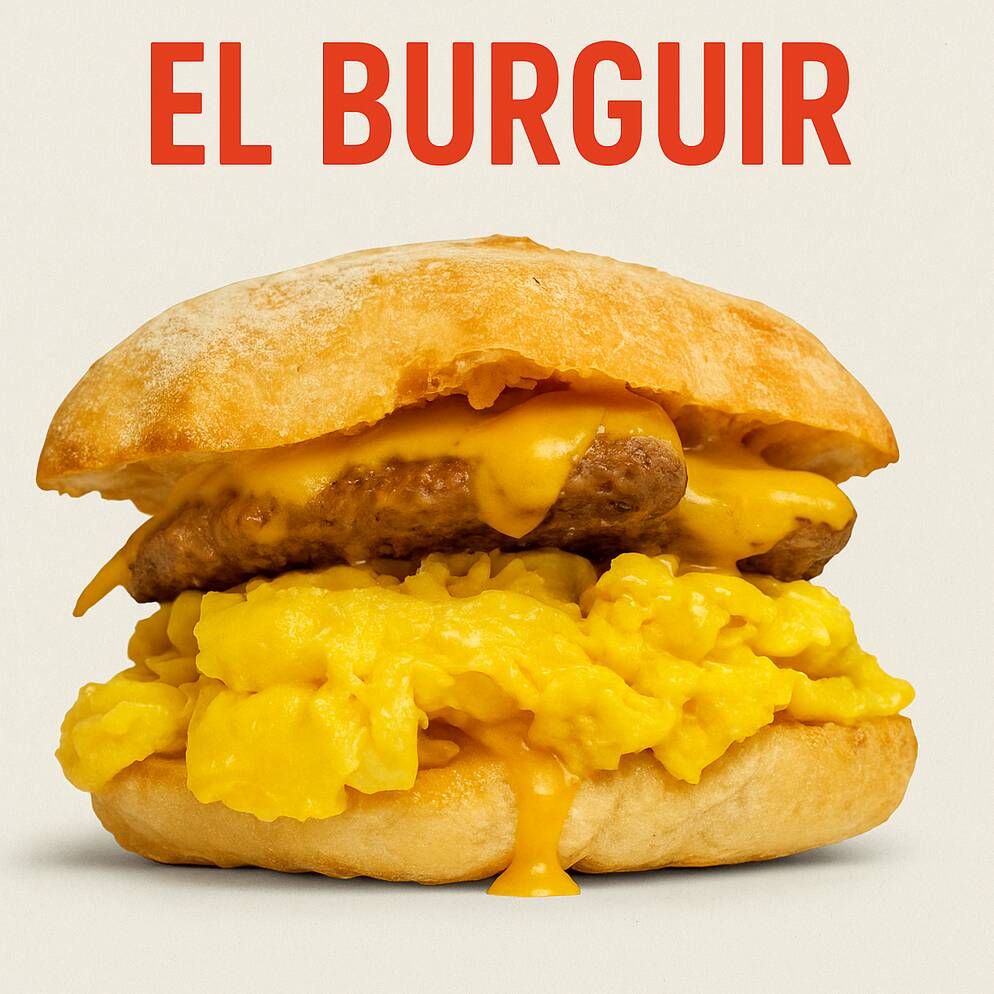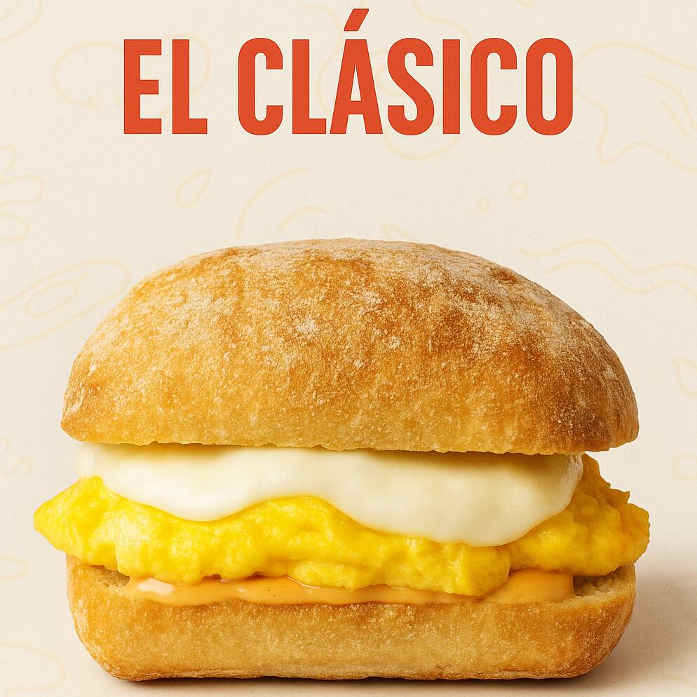Pan ciabatta dorado, huevo esponjoso, queso americano, carne de hamburguesa y cebolla caramelizada.