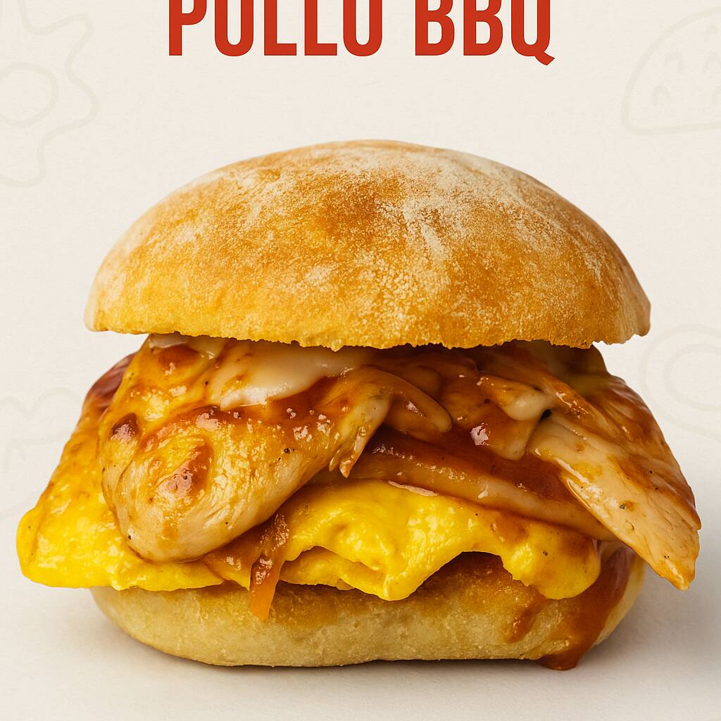 Pan ciabatta dorado, huevo esponjoso, queso mozzarella, tiras de pollo BBQ y cebolla caramelizada.