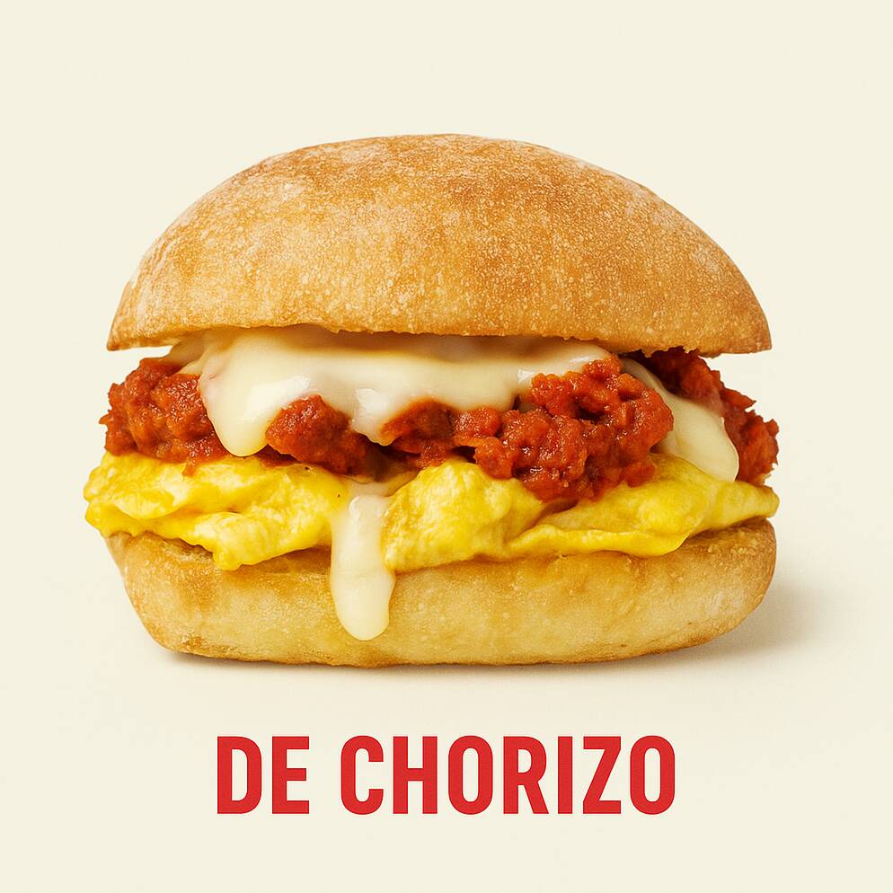 Pan ciabatta dorado, huevo esponjoso, chorizo y queso mozzarella.