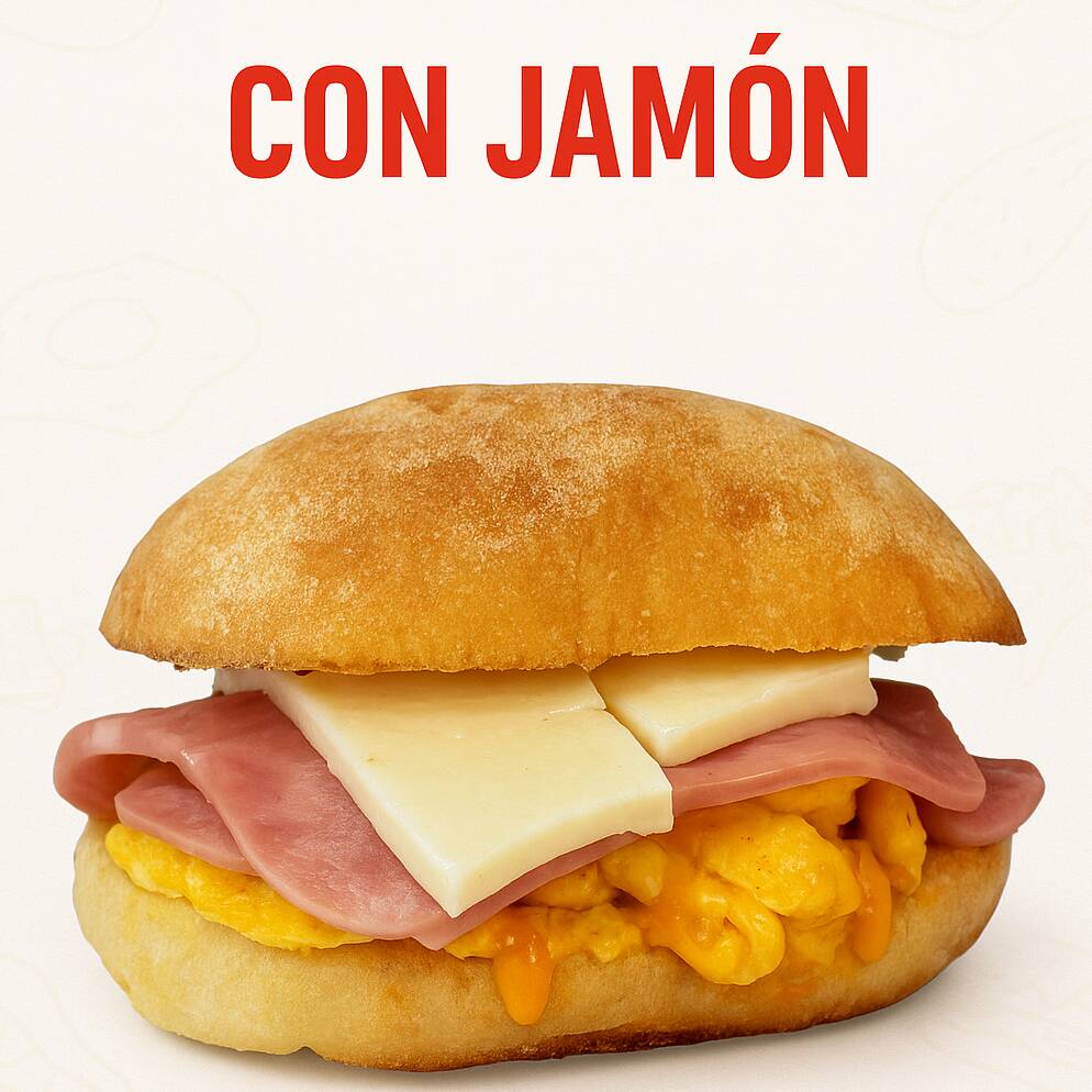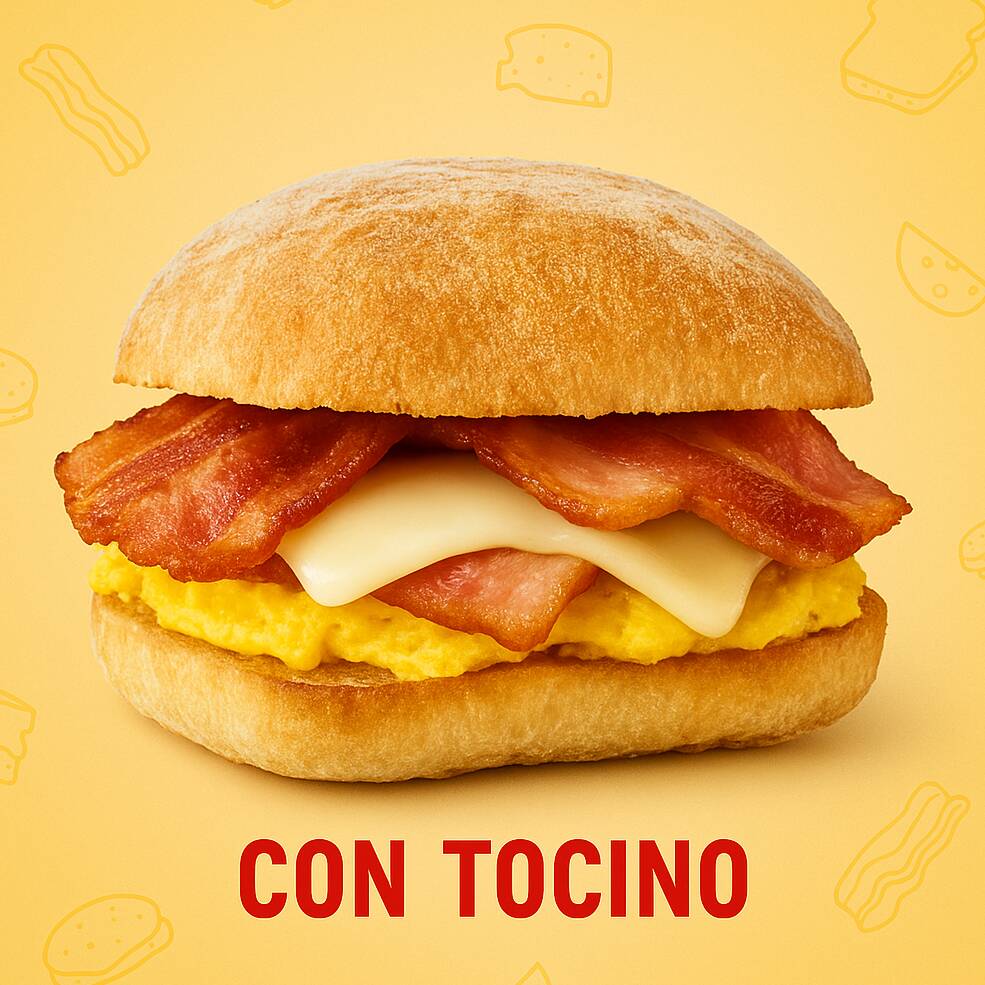 Pan ciabatta dorado, huevo esponjoso, tocino crujiente y queso mozzarella.