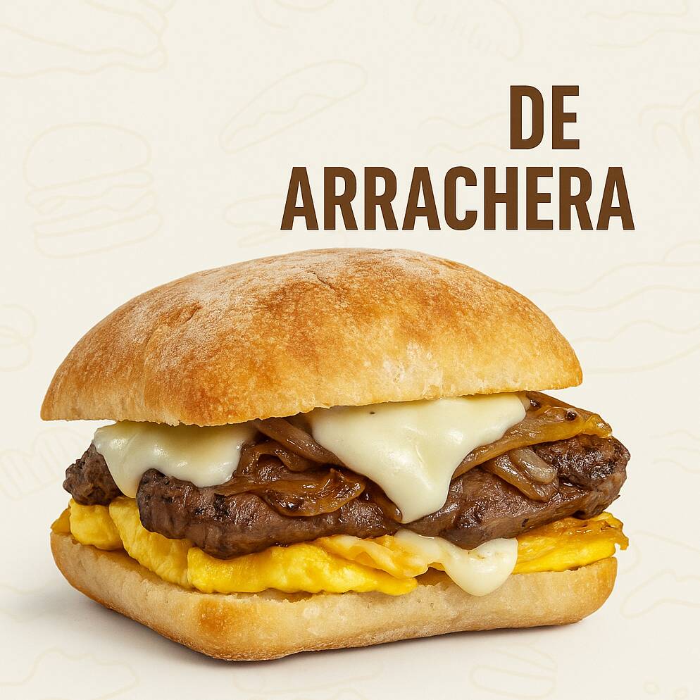 Pan ciabatta dorado, huevo esponjoso, carne arrachera, queso mozzarella y cebolla caramelizada.