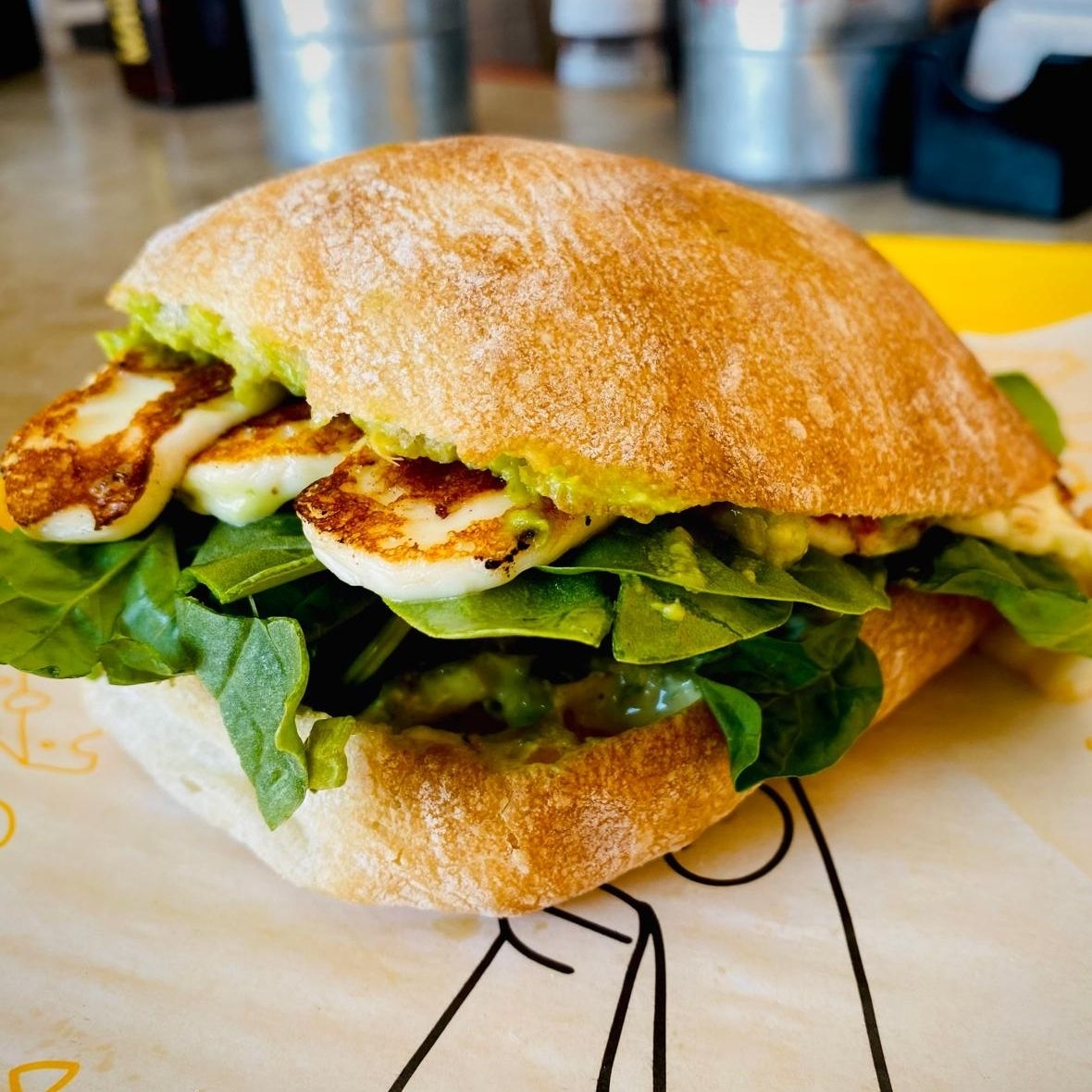 Pan ciabatta dorado, aguacate, queso panela y espinaca.