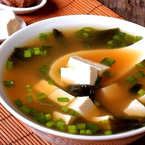 Tradicional sopa de fondo de pez bonita y fermentado de soya con tofú, alga wacame, fideo chino y hongo shitake
