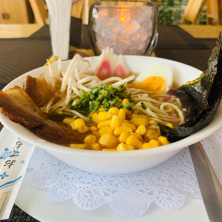 Tradicional sopa japonesa preparada por mas de 48 horas de cocción, pasta ramen, naruto, huevo, cebollín, elote, alga nori y panceta de cerdo