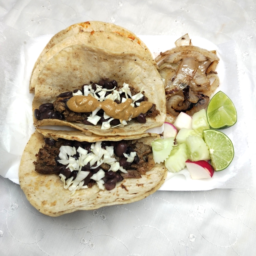 Tortilla de harina XG, cargada con queso. Con cebolla asada, rábano, pepino, limón y salsa's al lado.