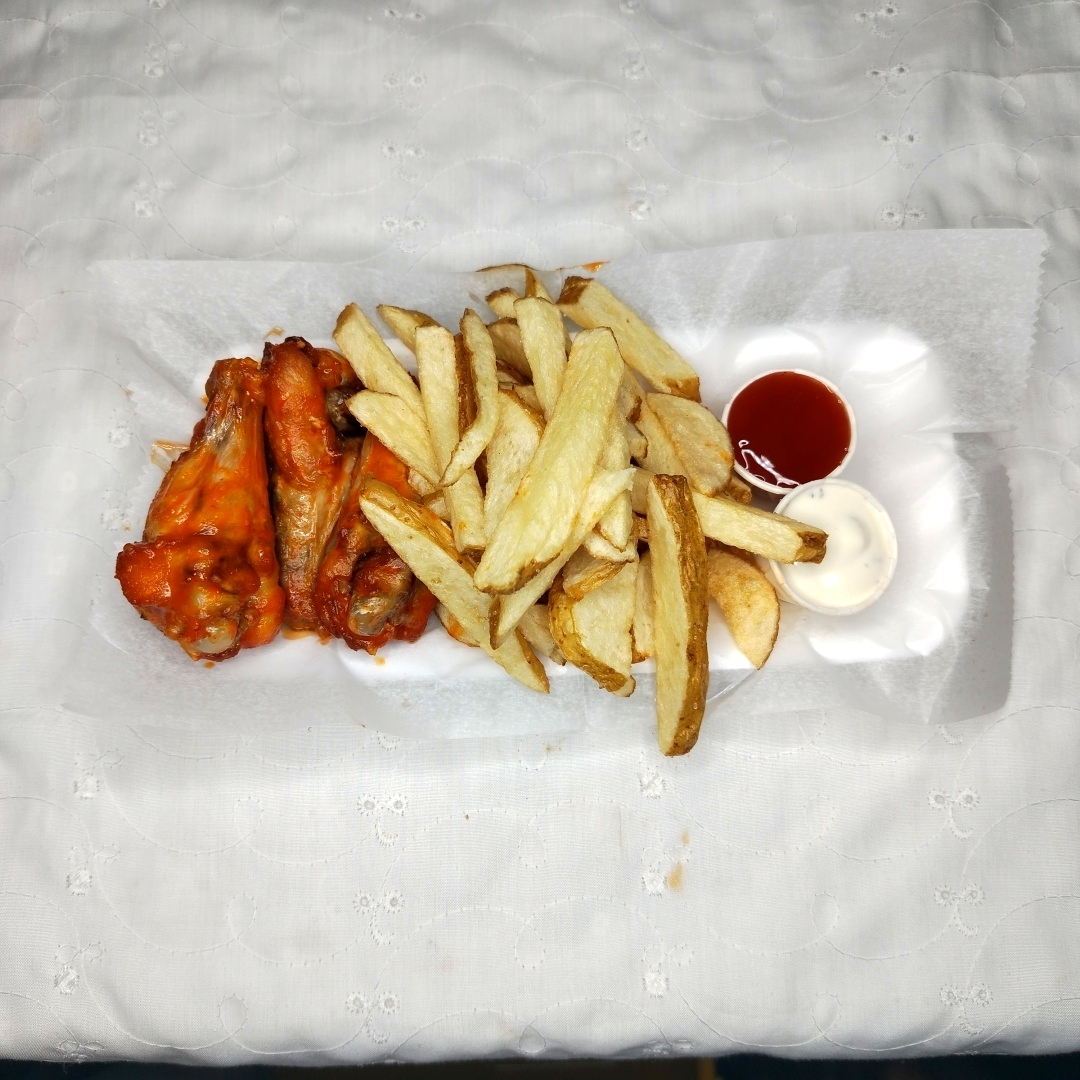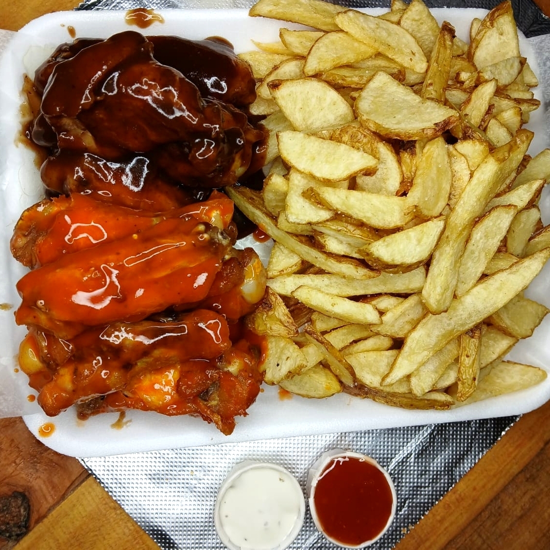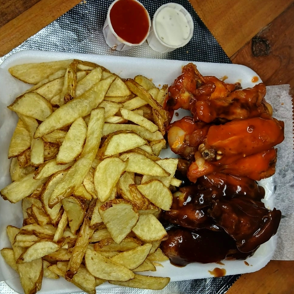 Catsup + 1/2 Canasta de Papas + Aderezo Ranch + 3 Alitas + Salsa