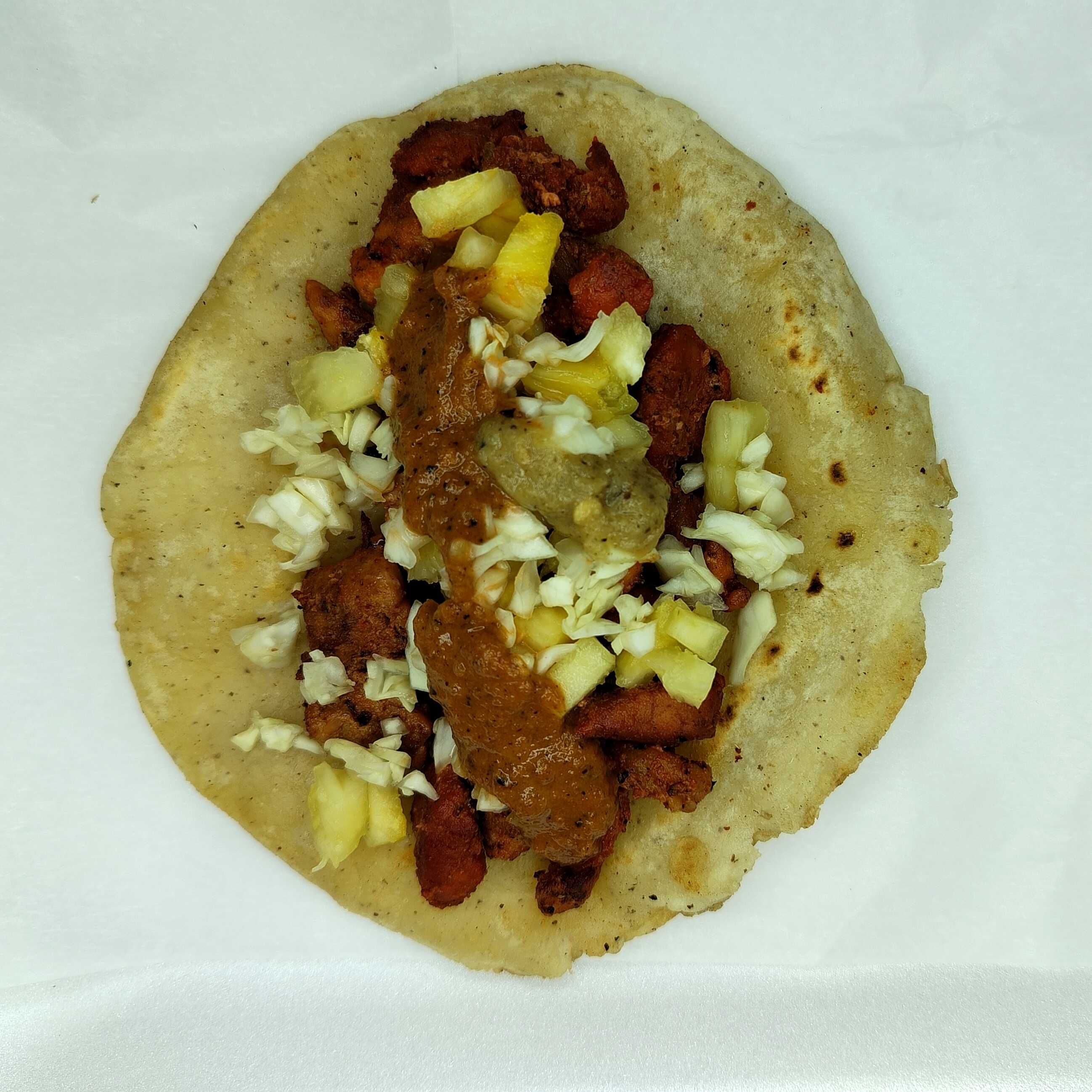 Una tortilla de maíz tamaño normal, carne Al Pasto, vestido con pedazos de piña, col. Con salsas y limón al lado.