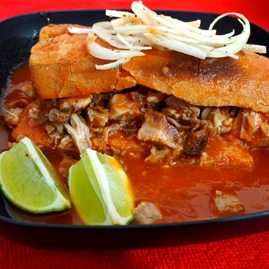 Birote salado con deliciosas carnitas de cerdo salsa de jitomate y sus cebollitas desflemadas